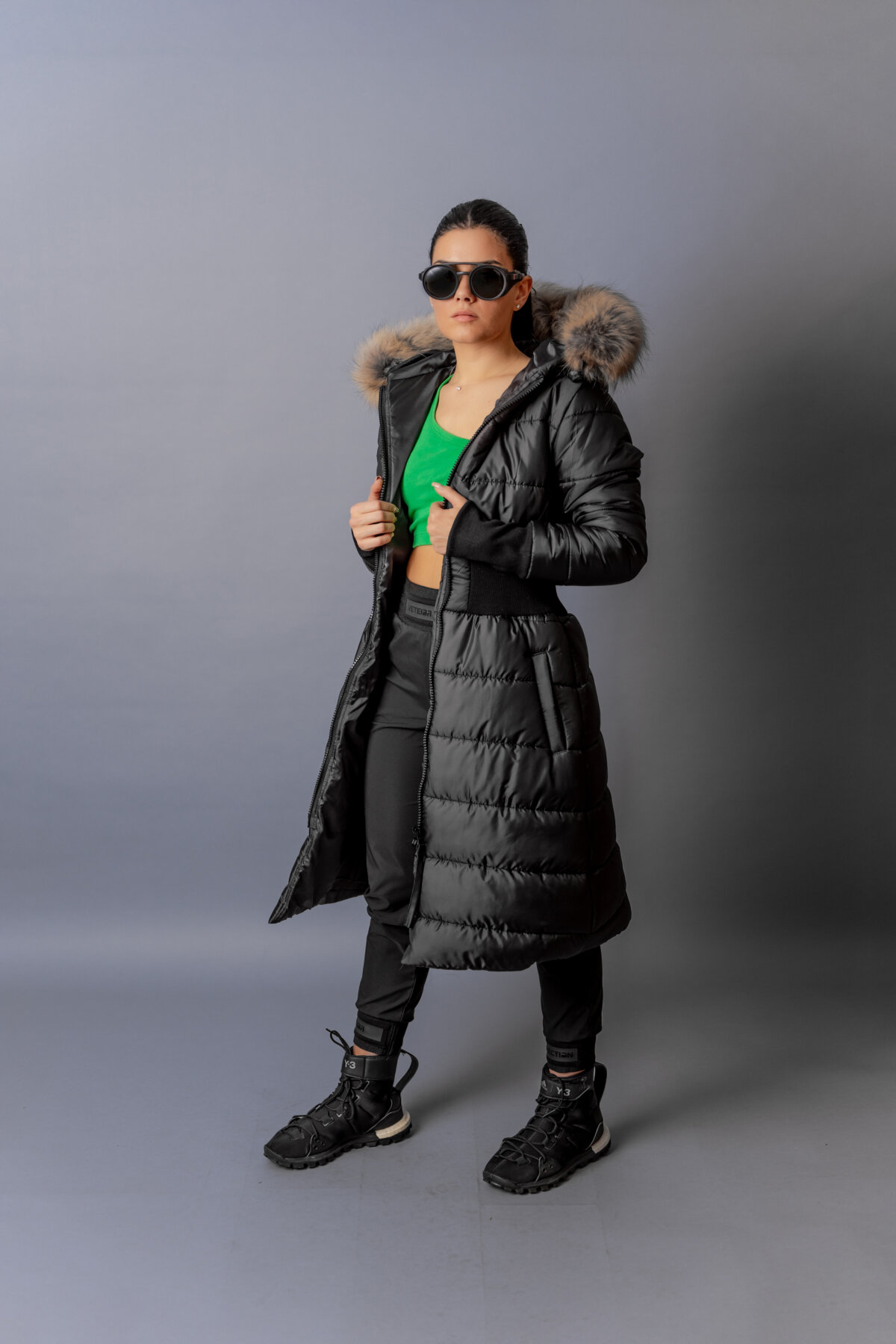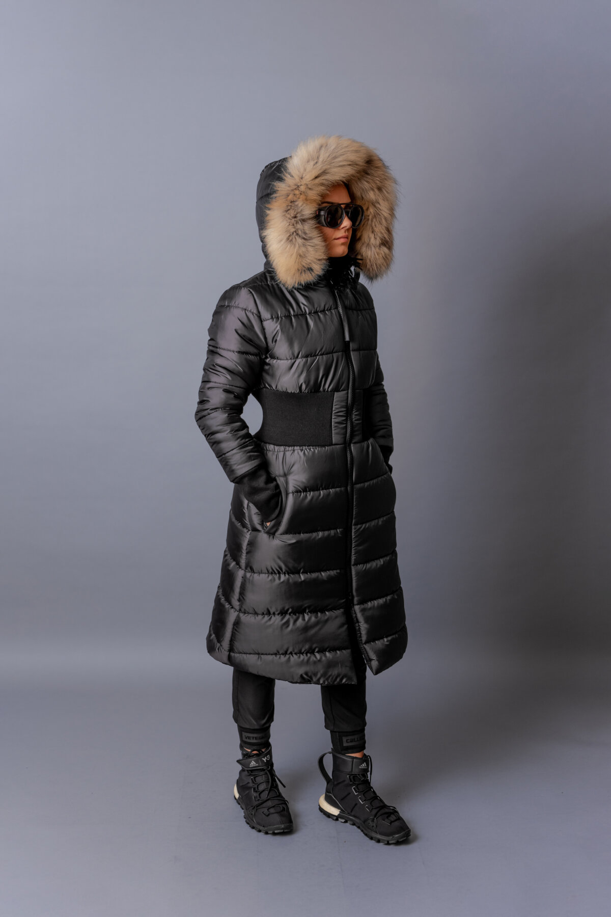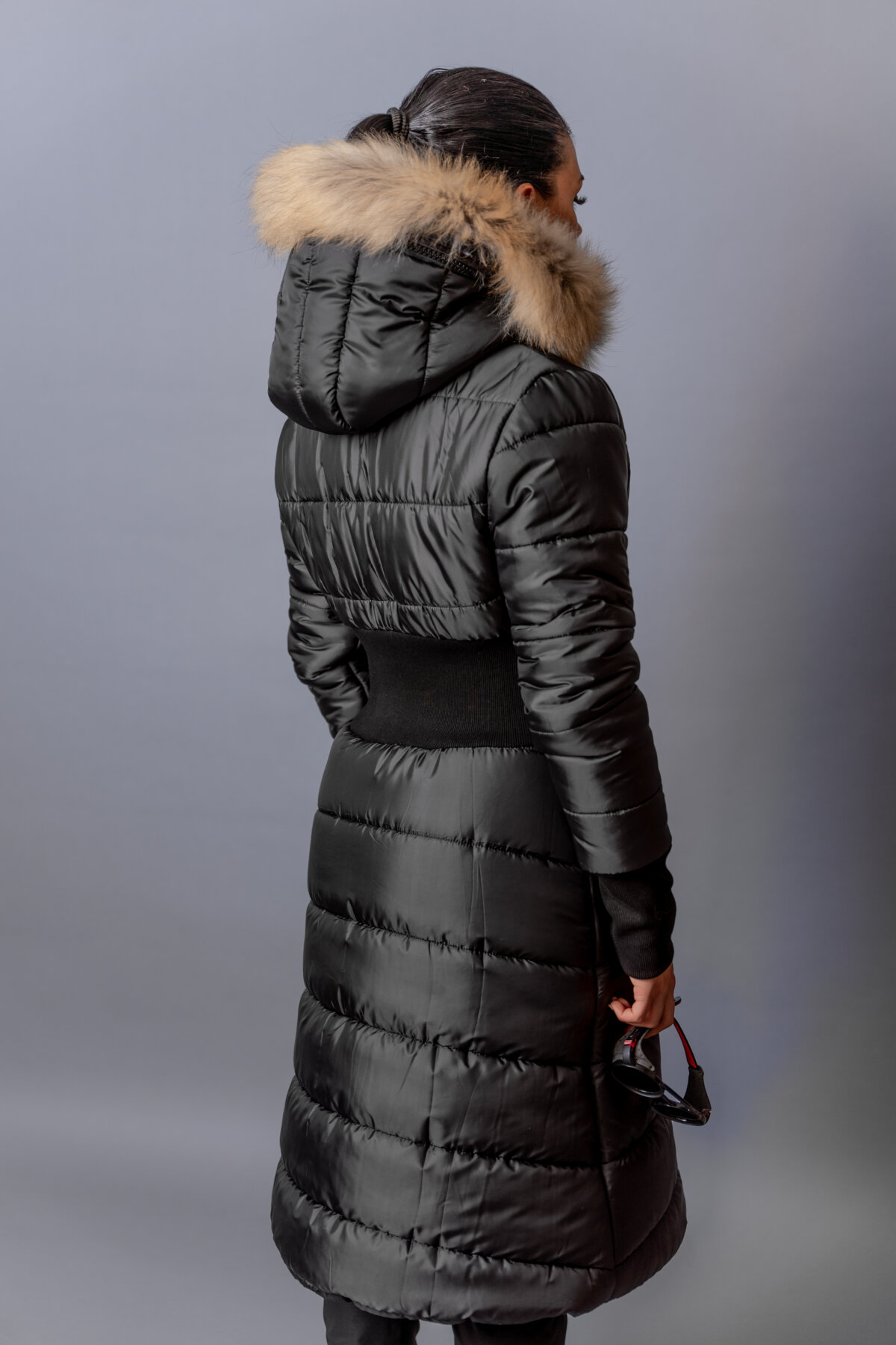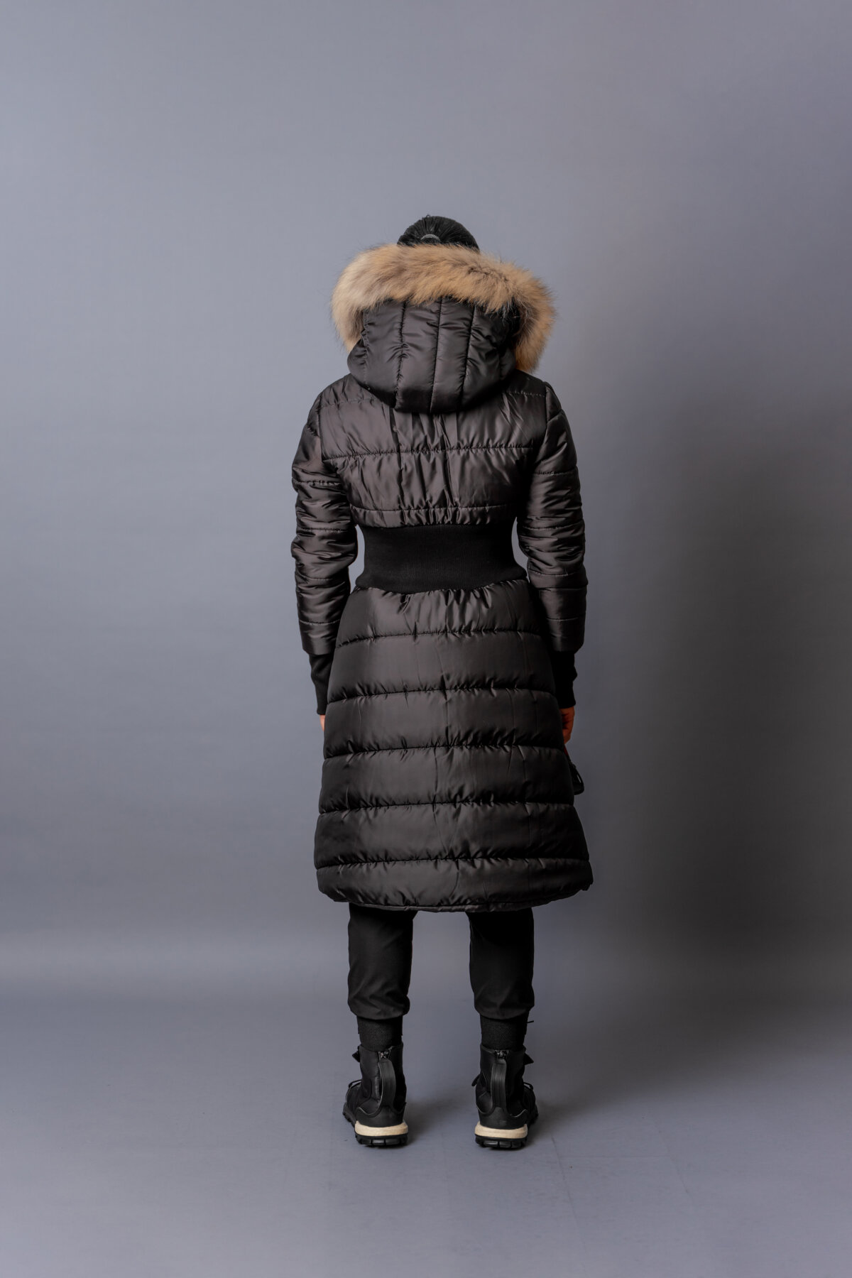 • Качулка с яка от естествен косъм с опция за сваляне.