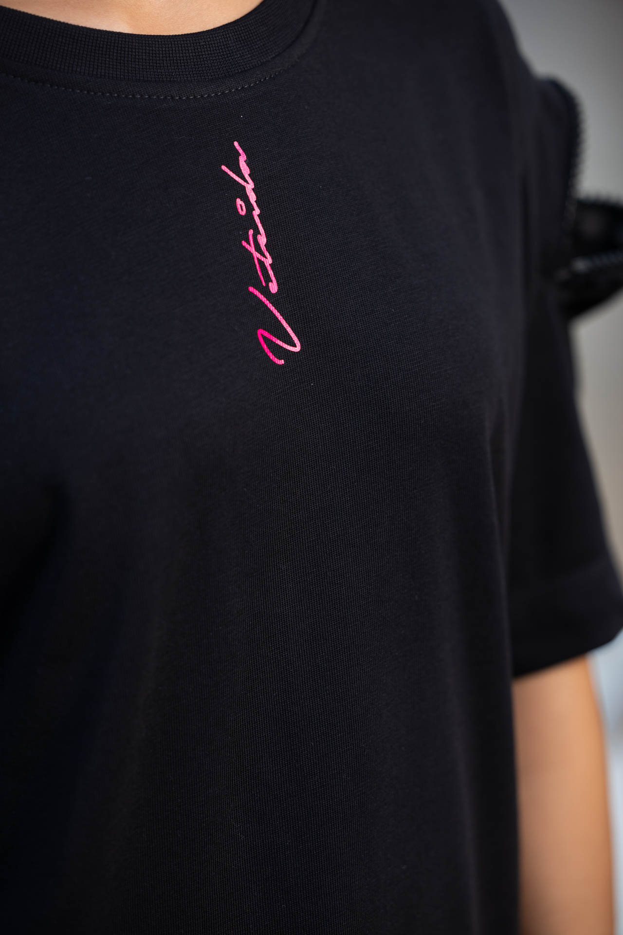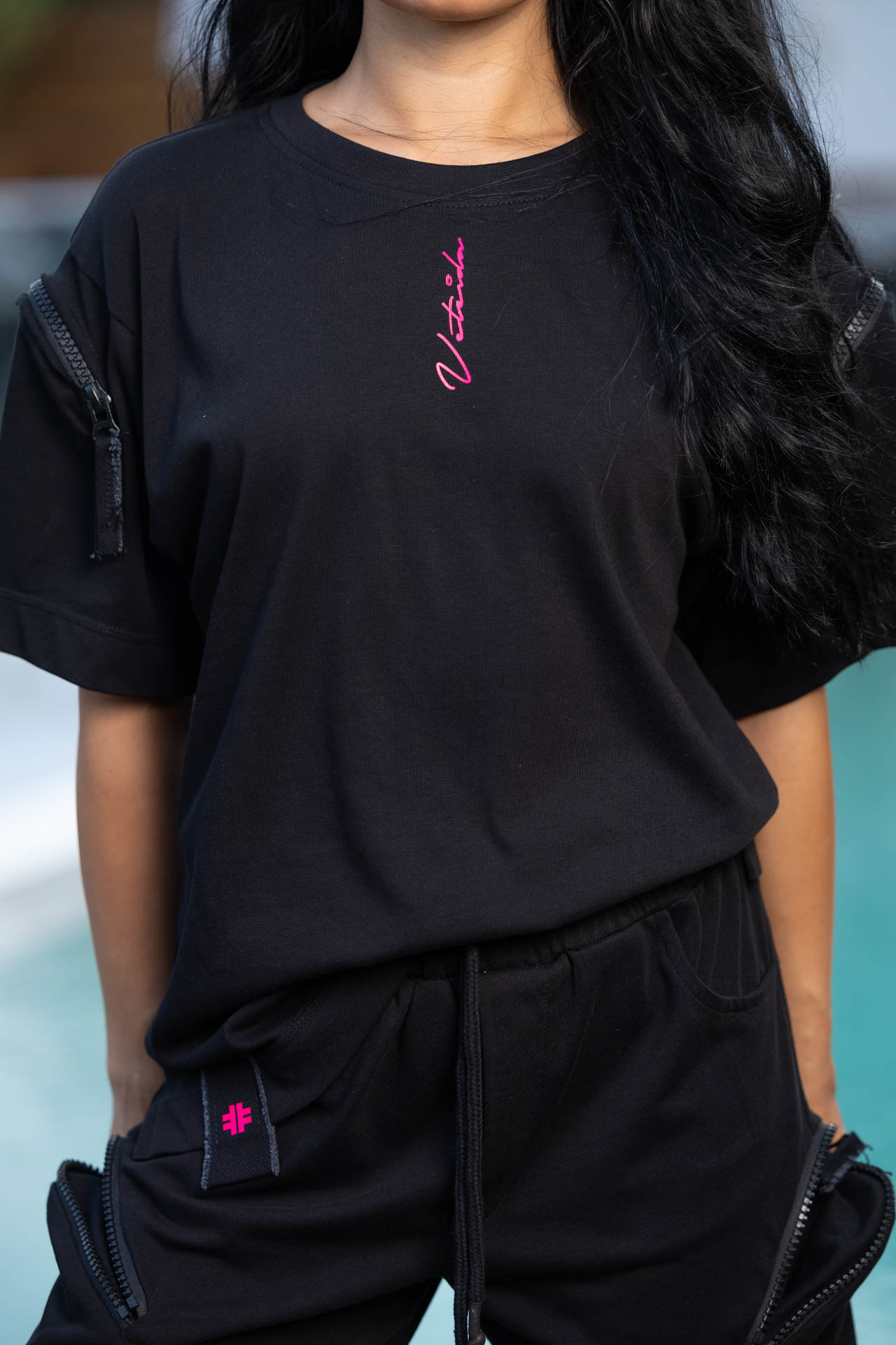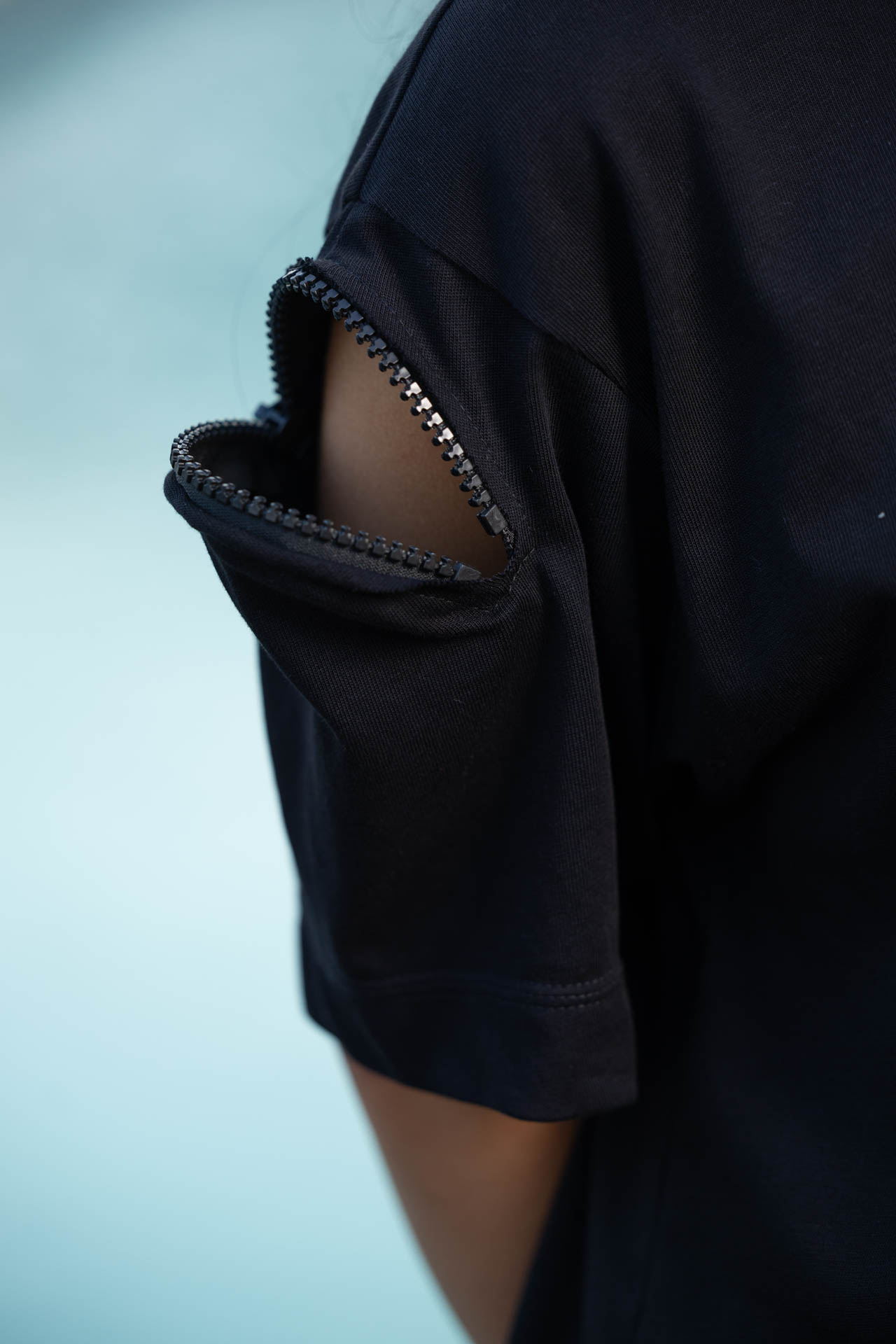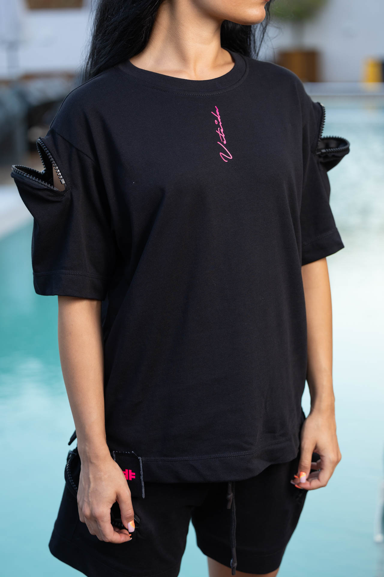 Модерна черна тениска, изработена от мек и качествен памук, която съчетава минимализъм с характерен акцент.