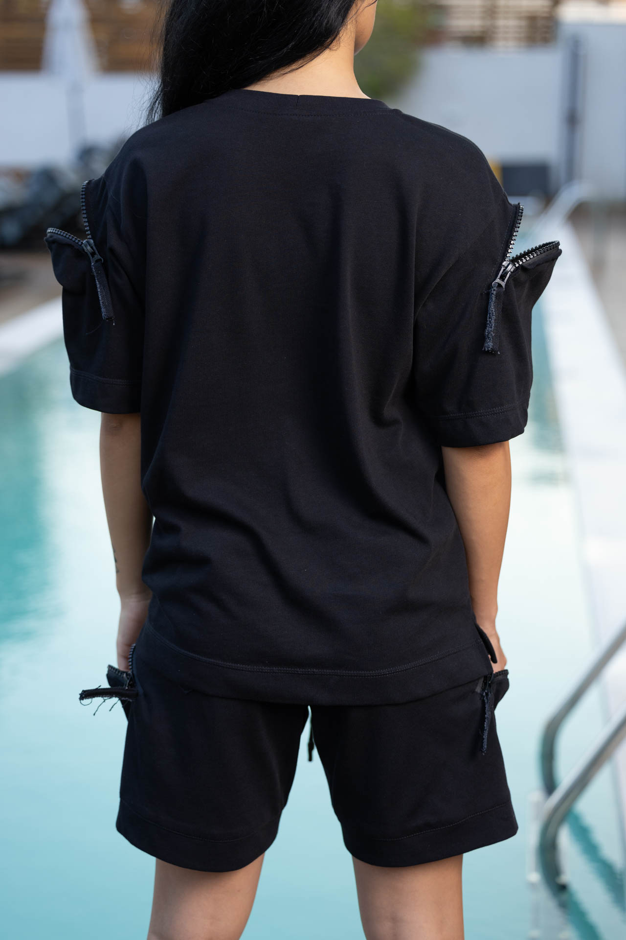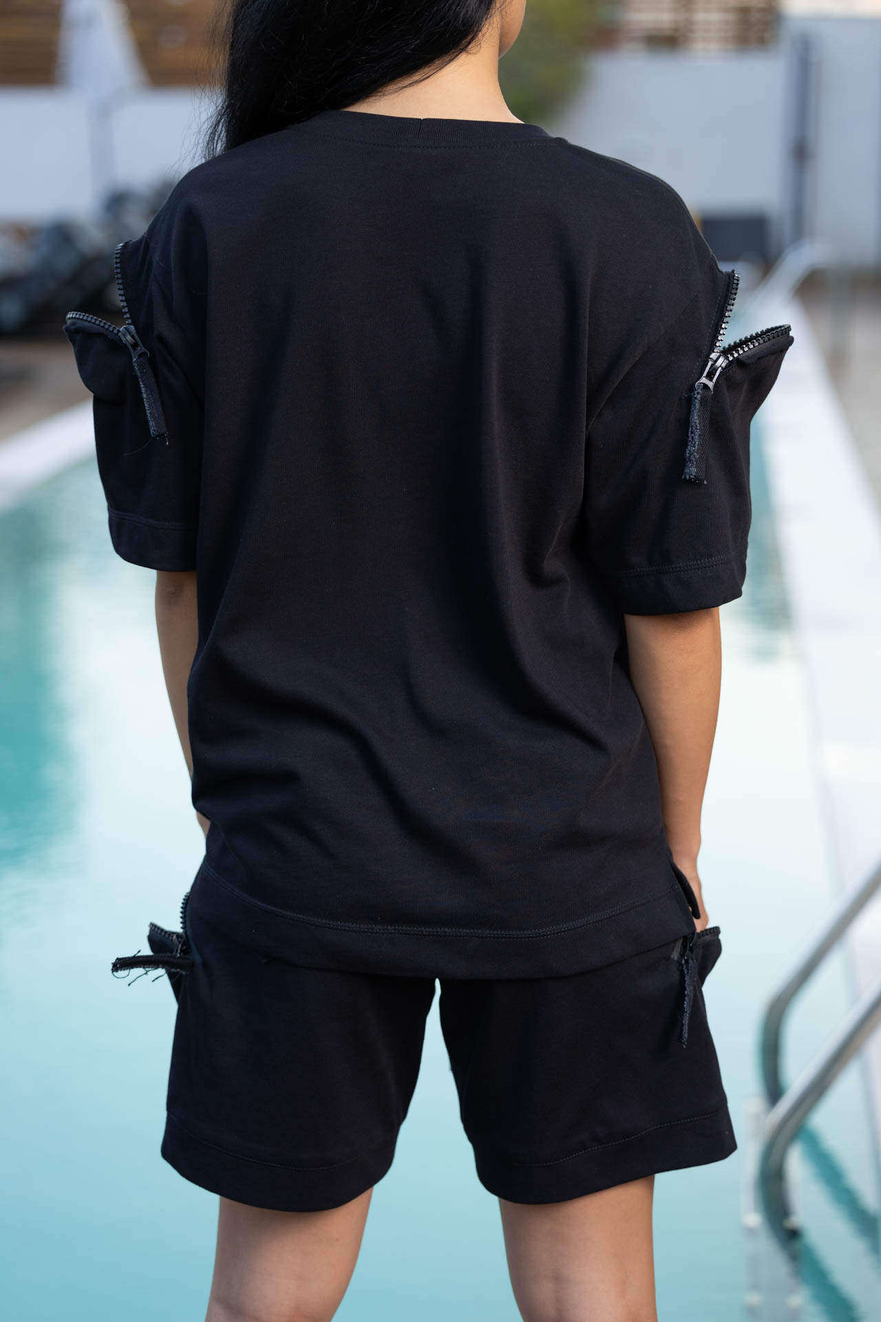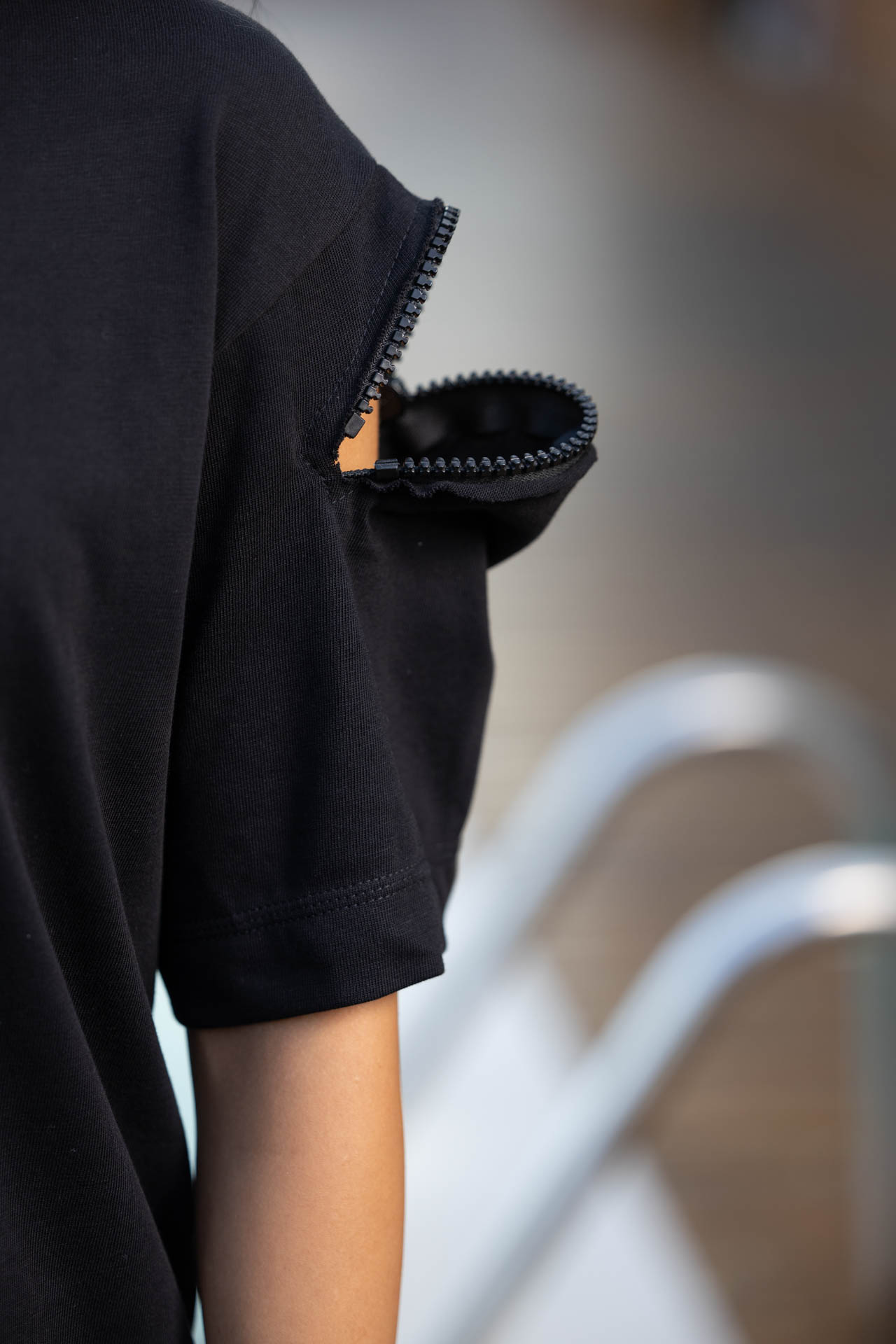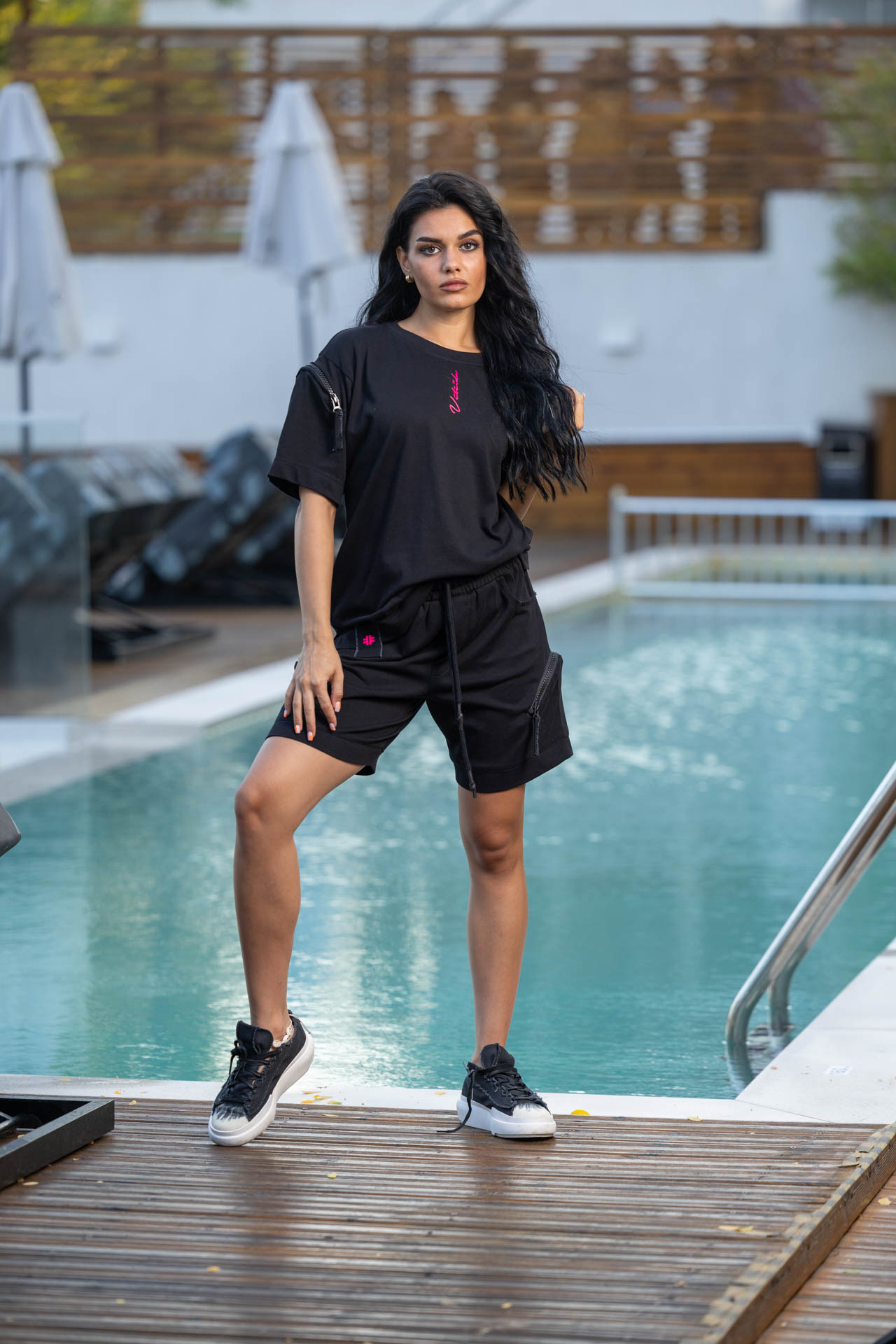 Модерна черна тениска, изработена от мек и качествен памук, която съчетава минимализъм с характерен акцент.