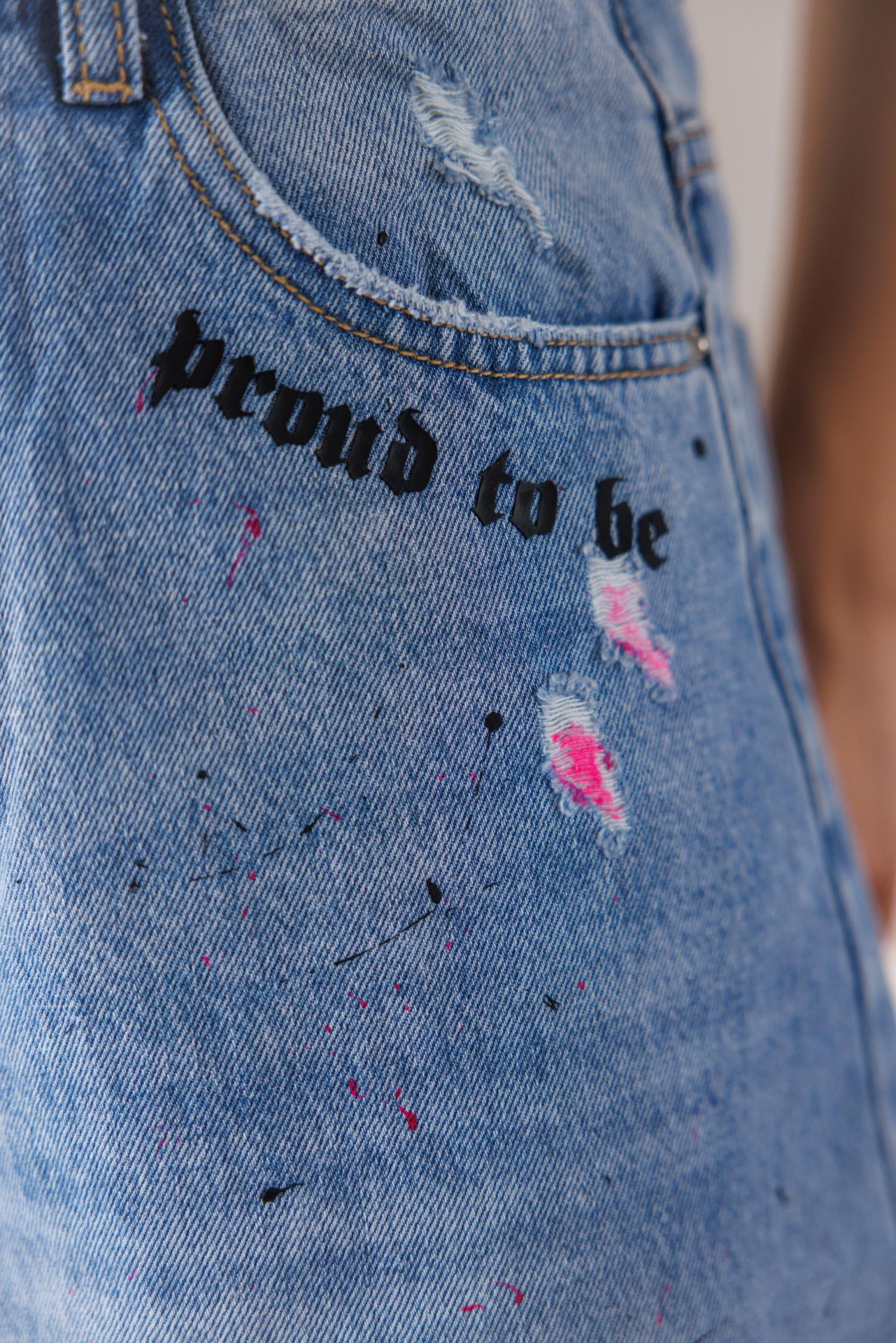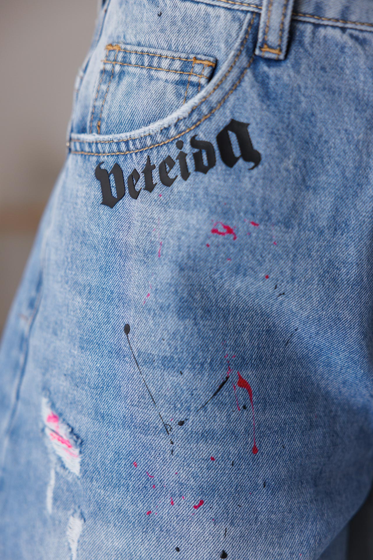• Акцентите включват ръчно нанесени пръски боя в розово и черно, както и стилни надписи “Proud to be” и “Veteida” на предната част.
