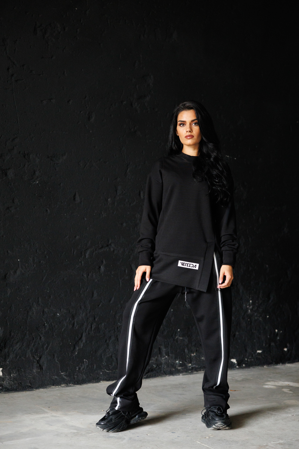Дамски комплект с ефектни панталони, съчетаващ елегантност и модерен стил.