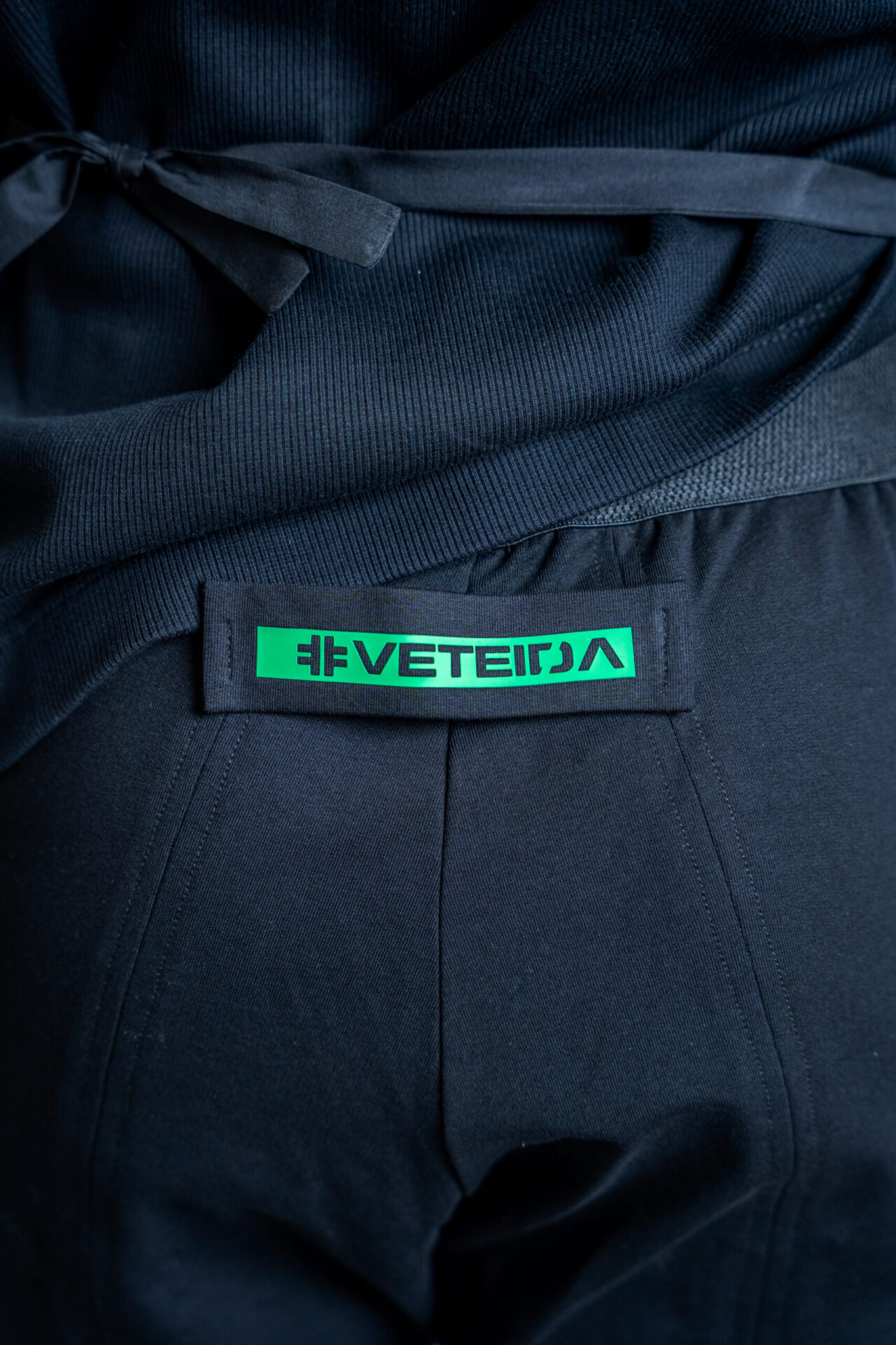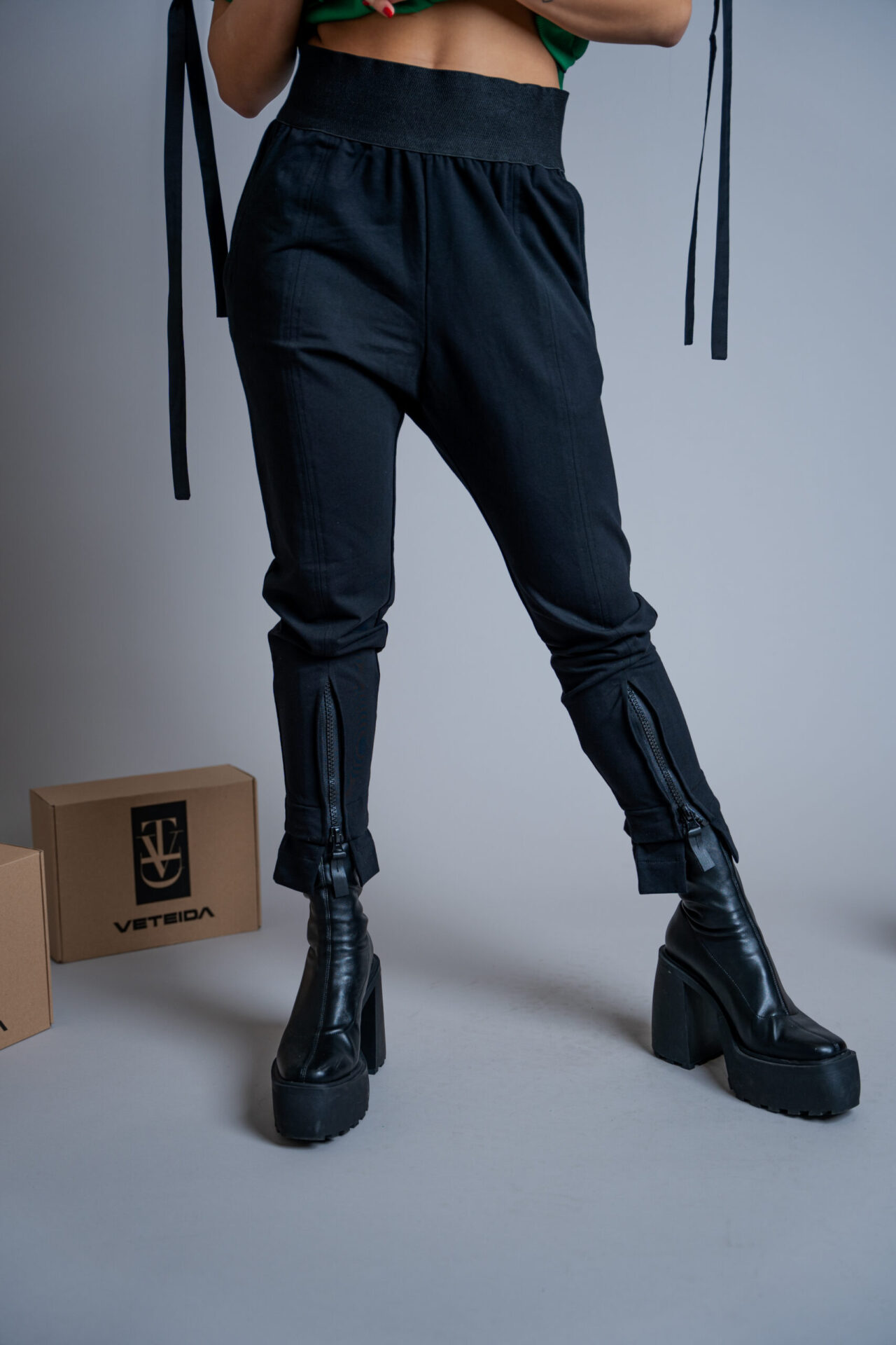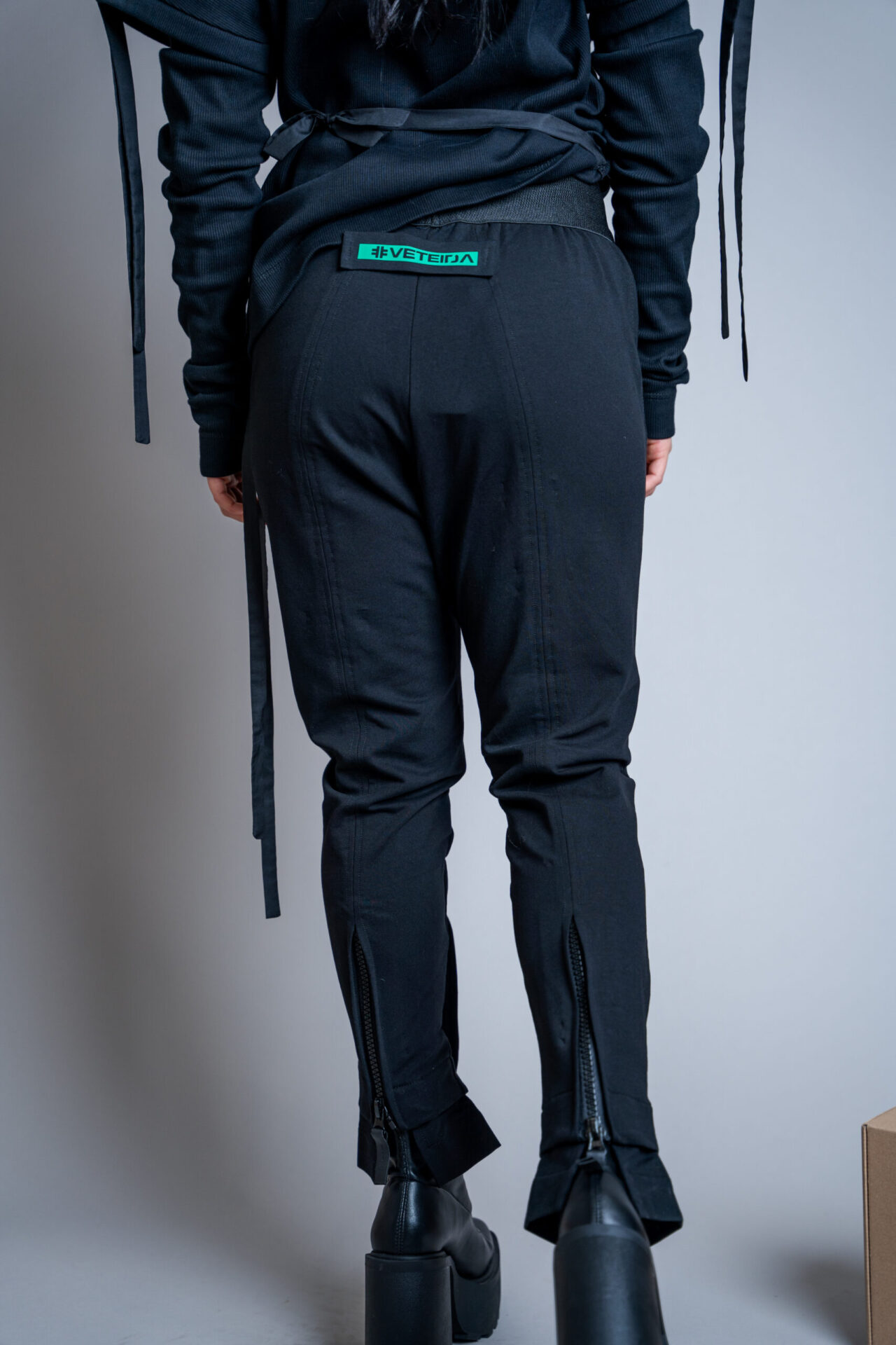 Панталона се отличава с широк колан на талията, ципове на крачолите.