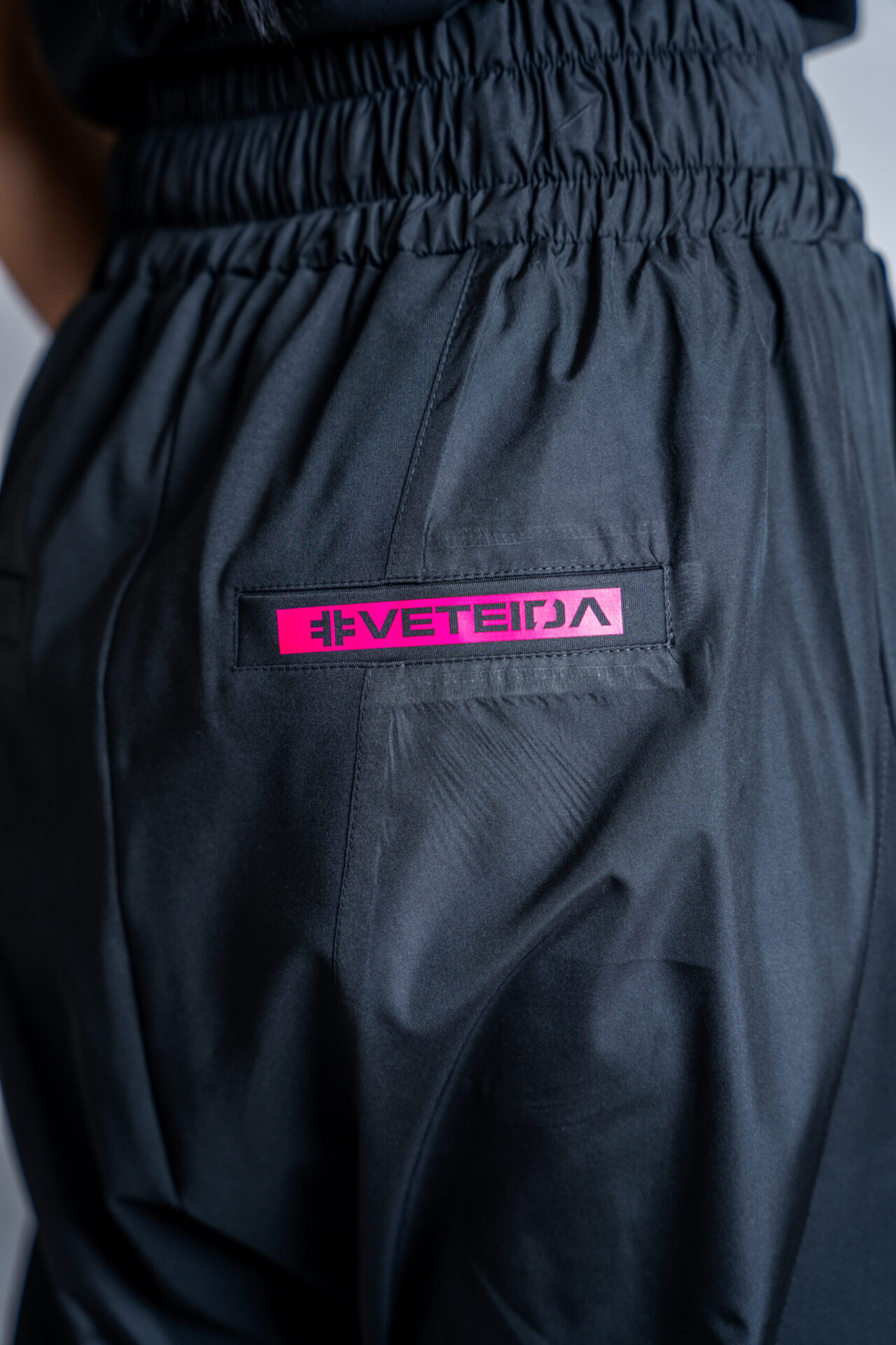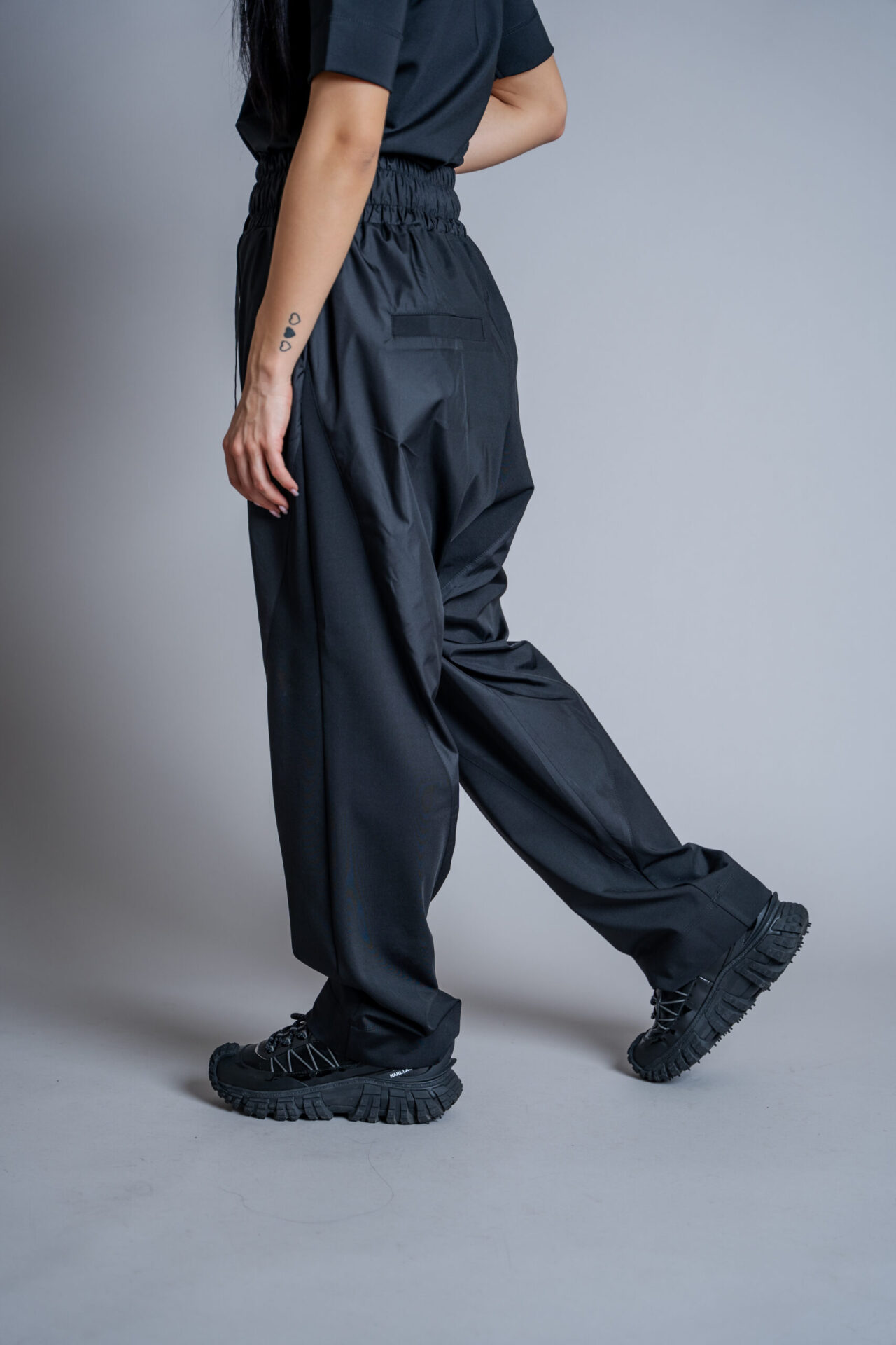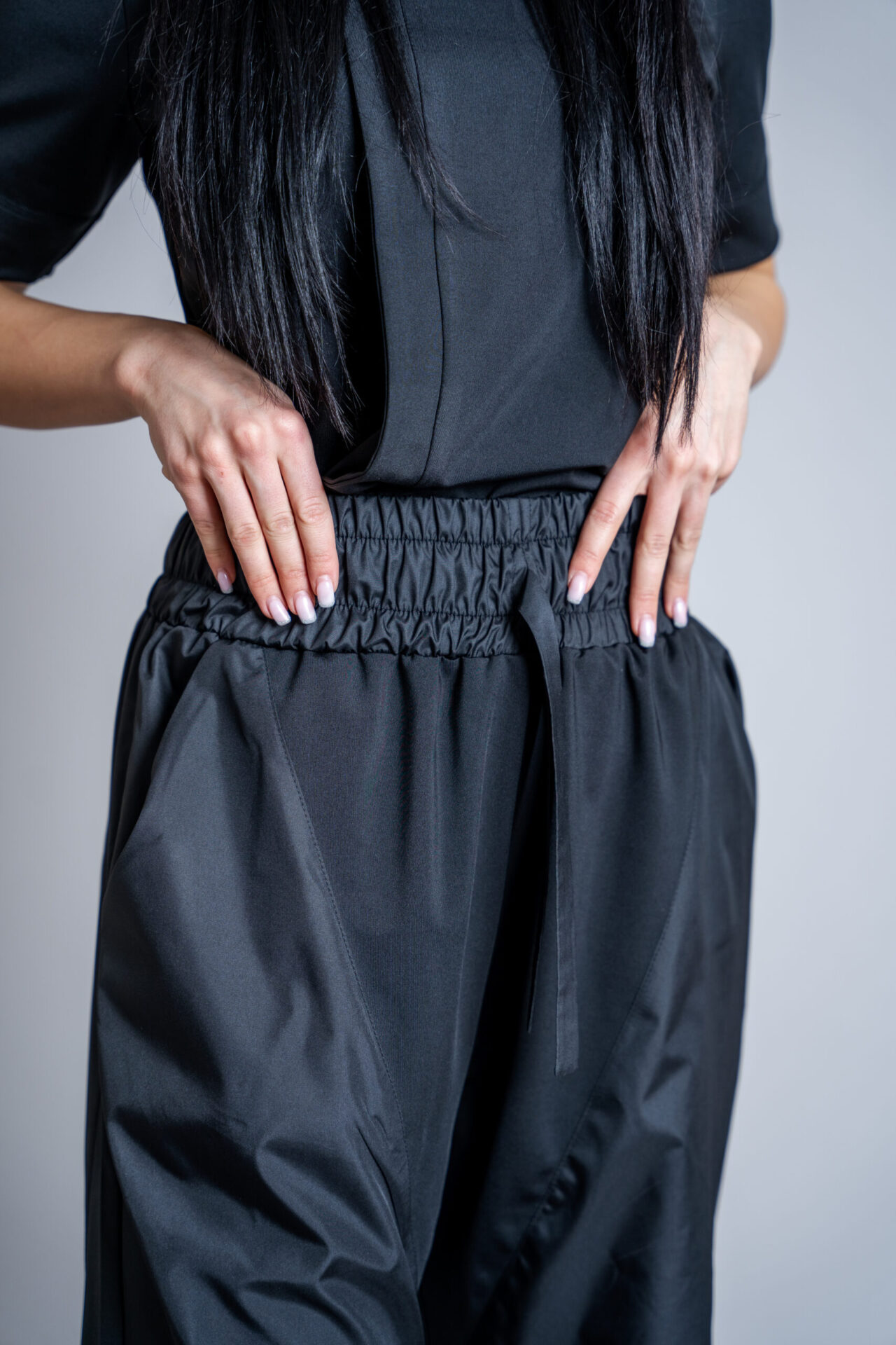 Отличава се със свободна кройка с диагонални странични джобове, широки крачоли.