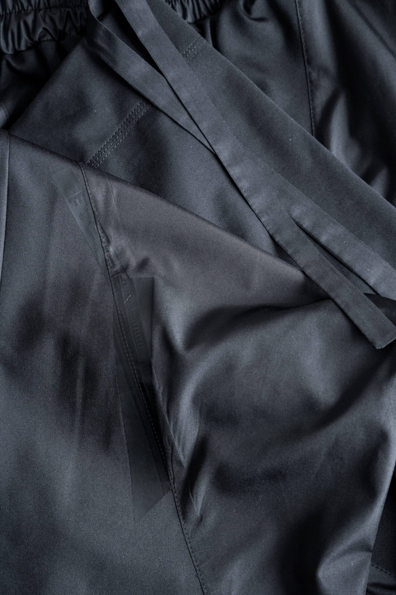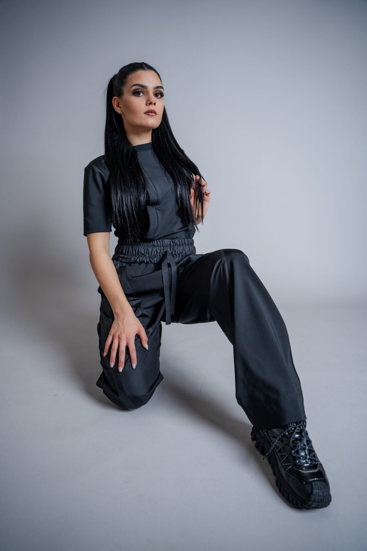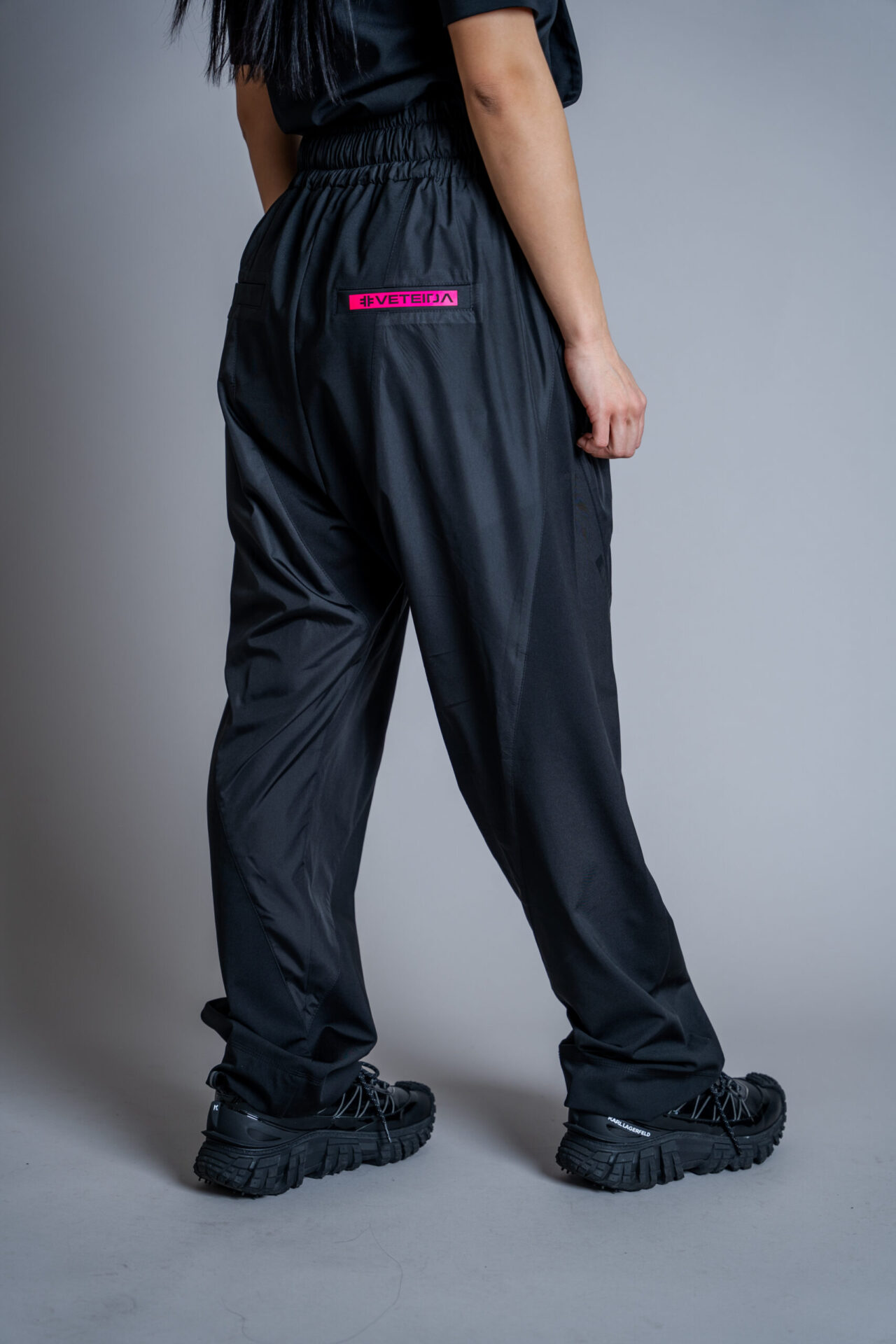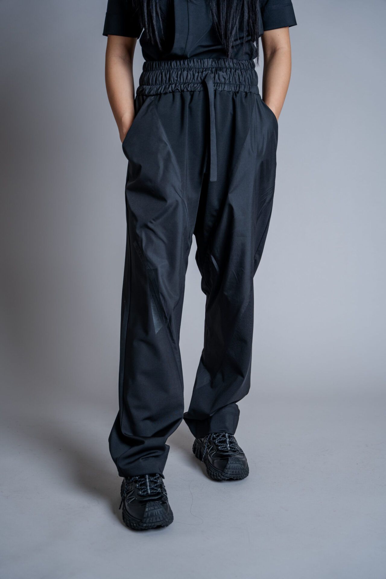 Отличава се със свободна кройка с диагонални странични джобове, широки крачоли.