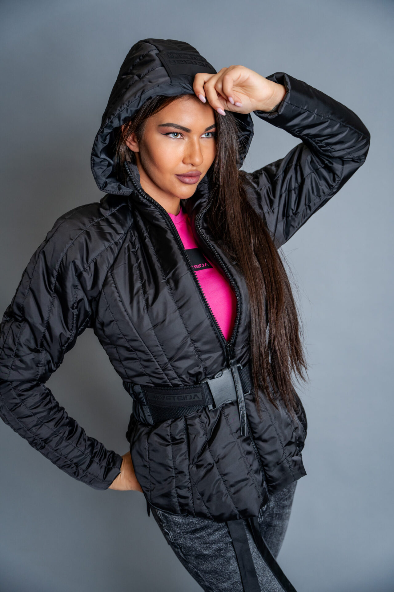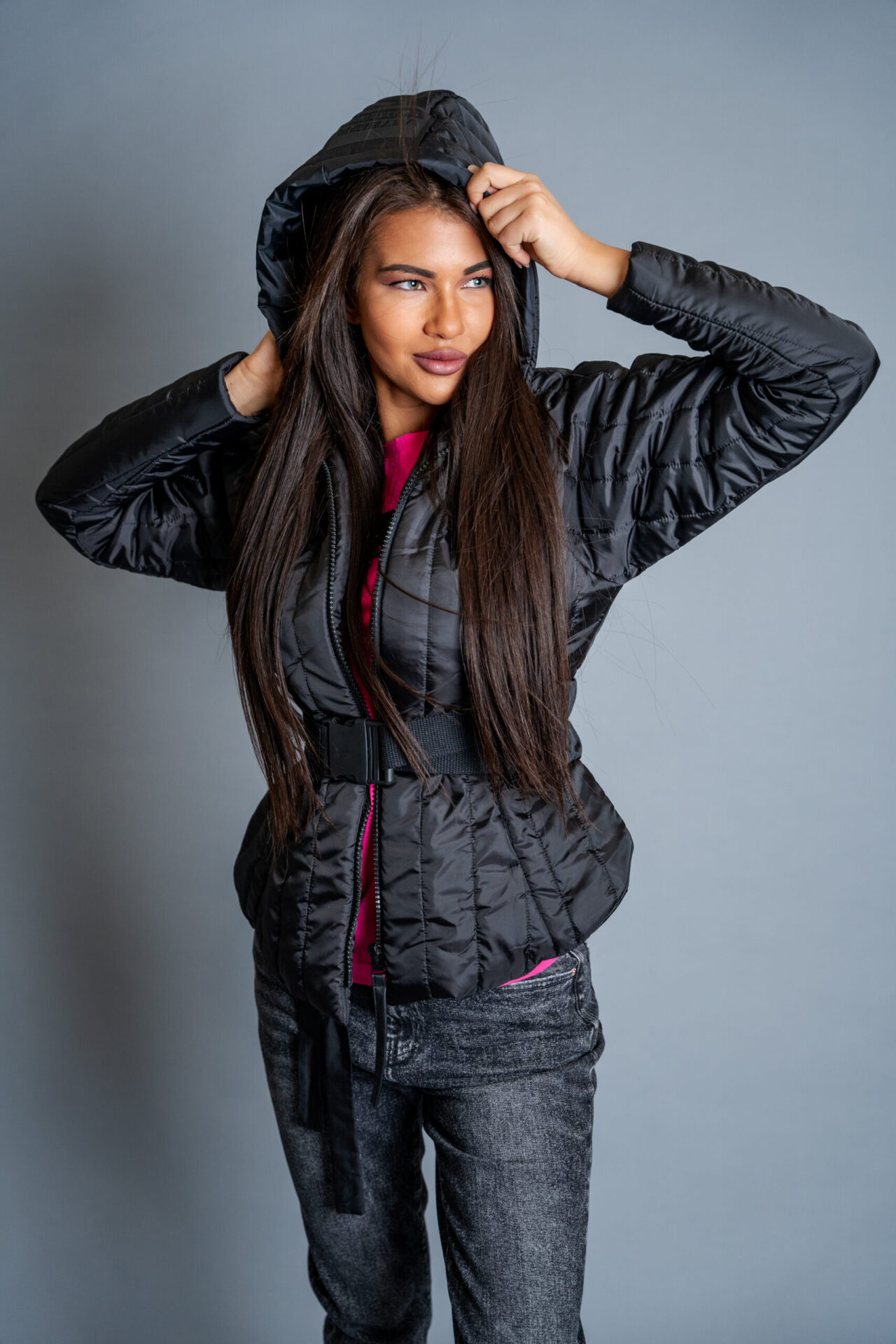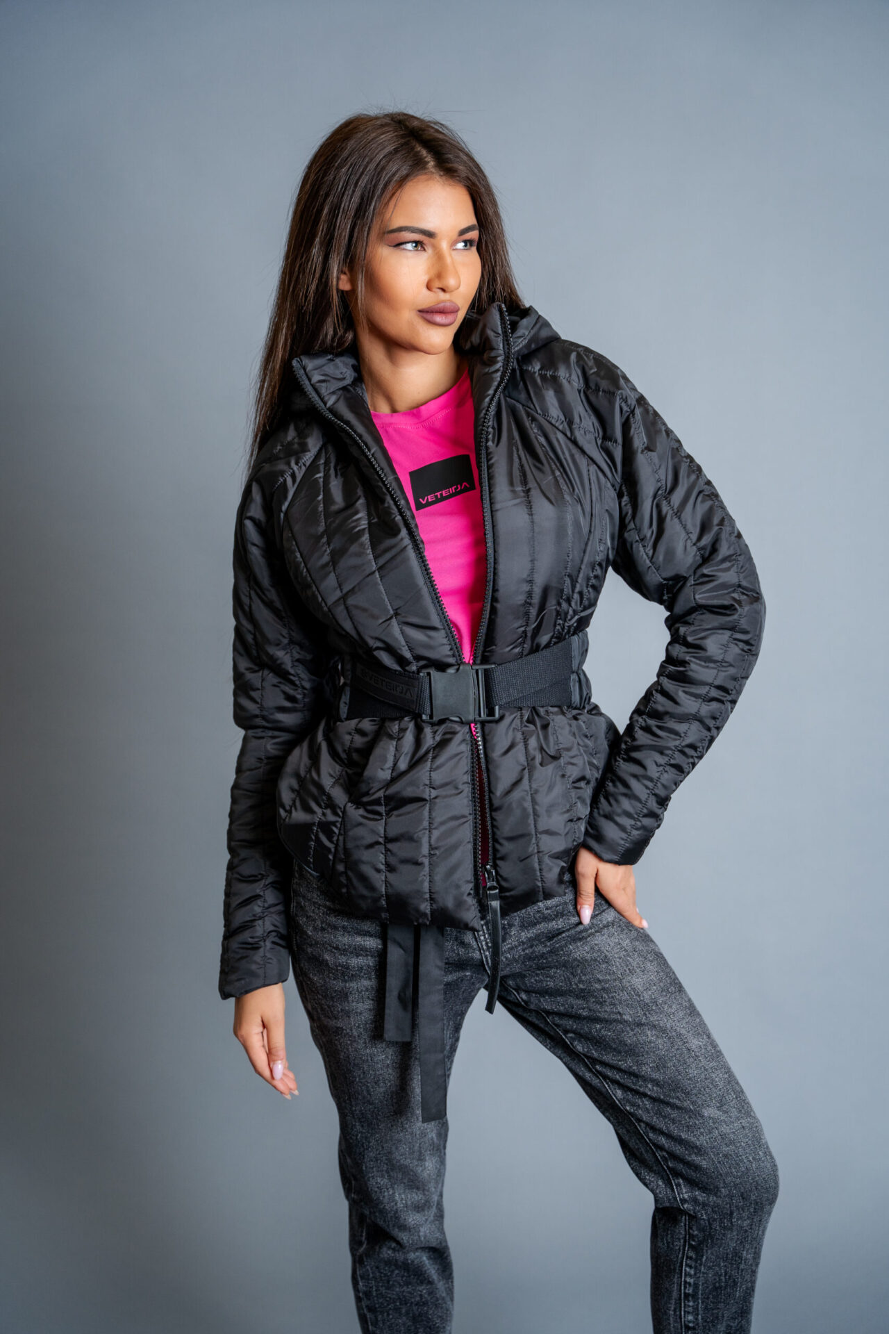 Якето се отличава с ефектни ръкави, колан на талията, голяма качулка.