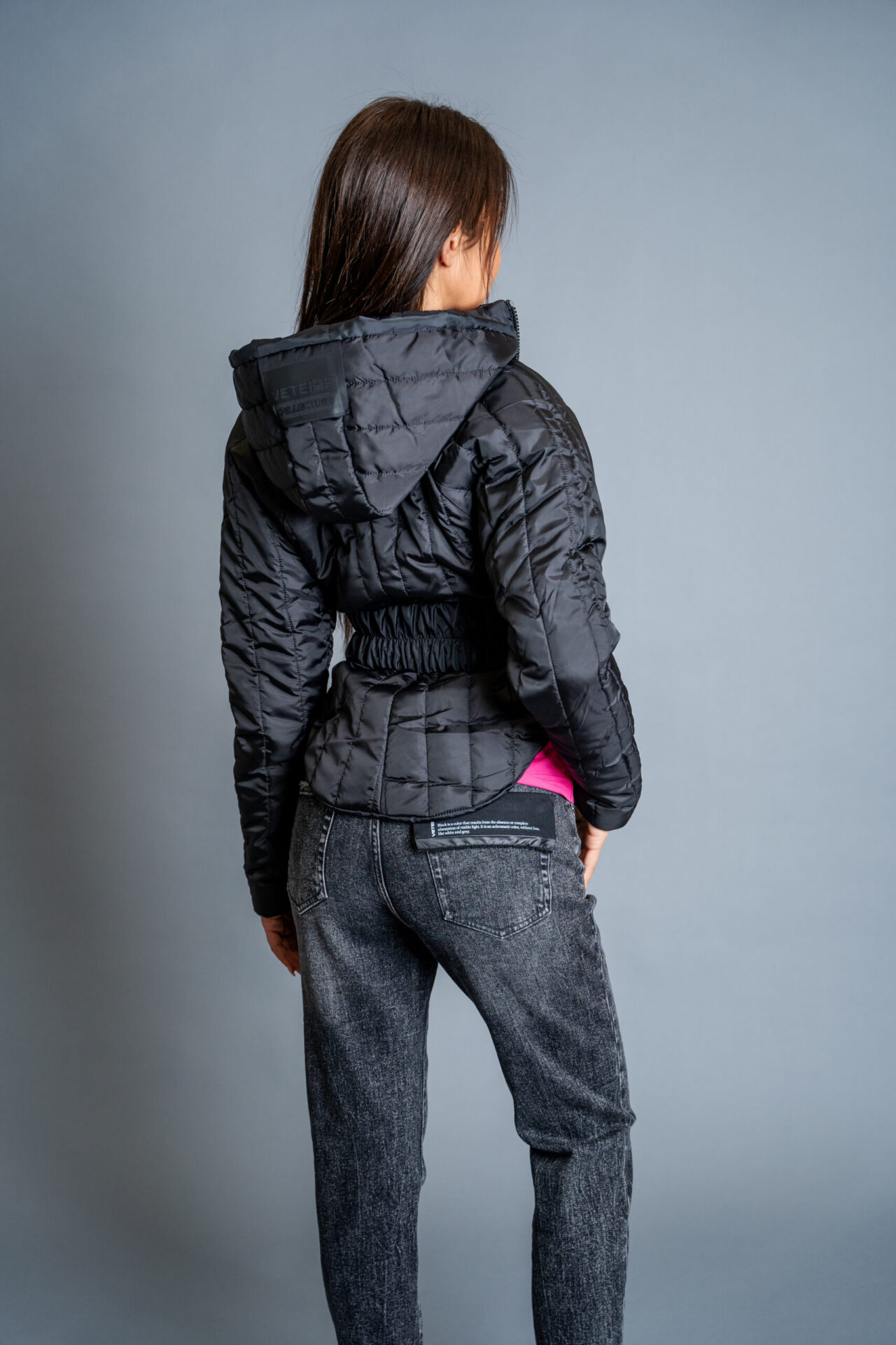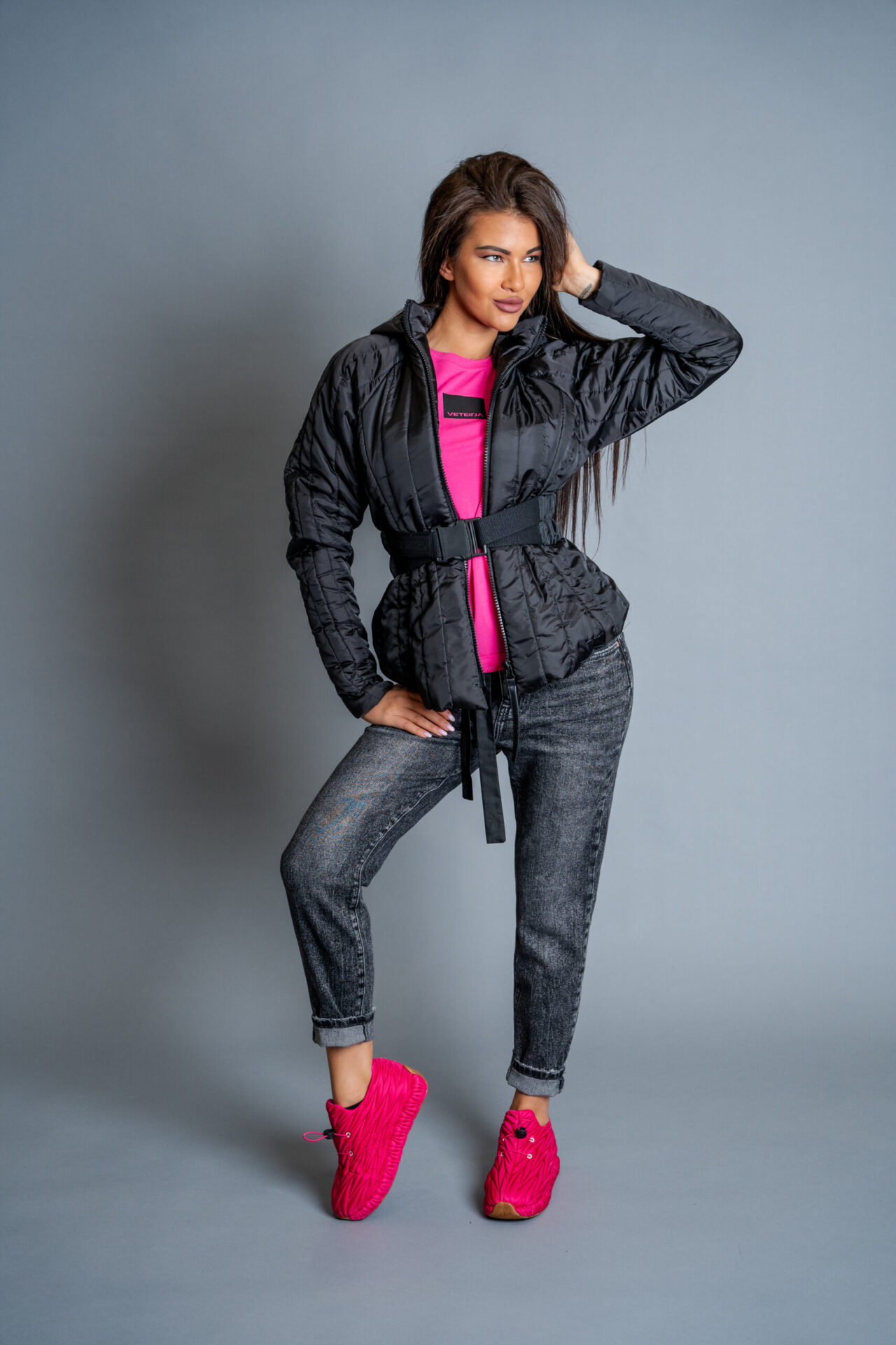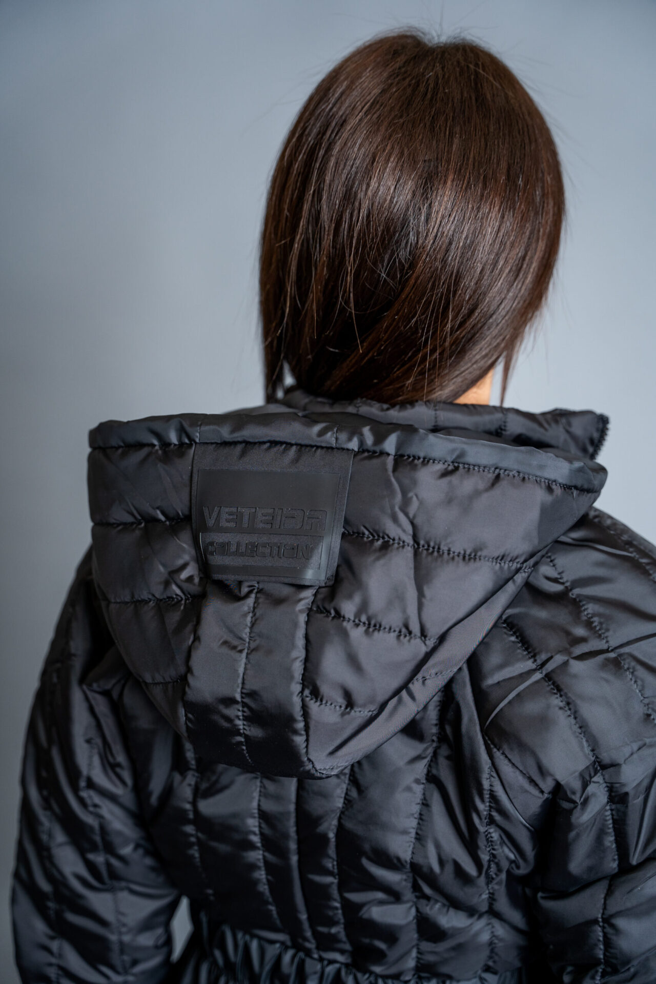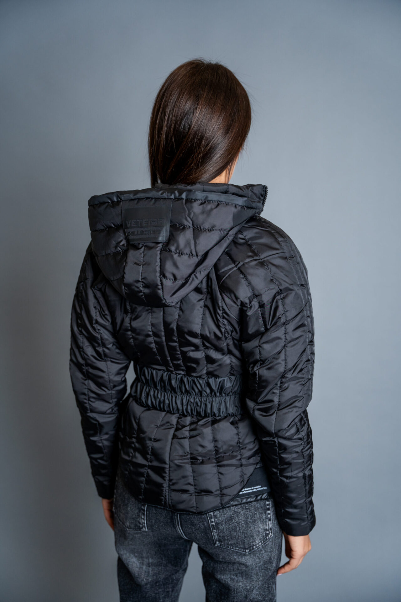 Якето се отличава с ефектни ръкави, колан на талията, голяма качулка.