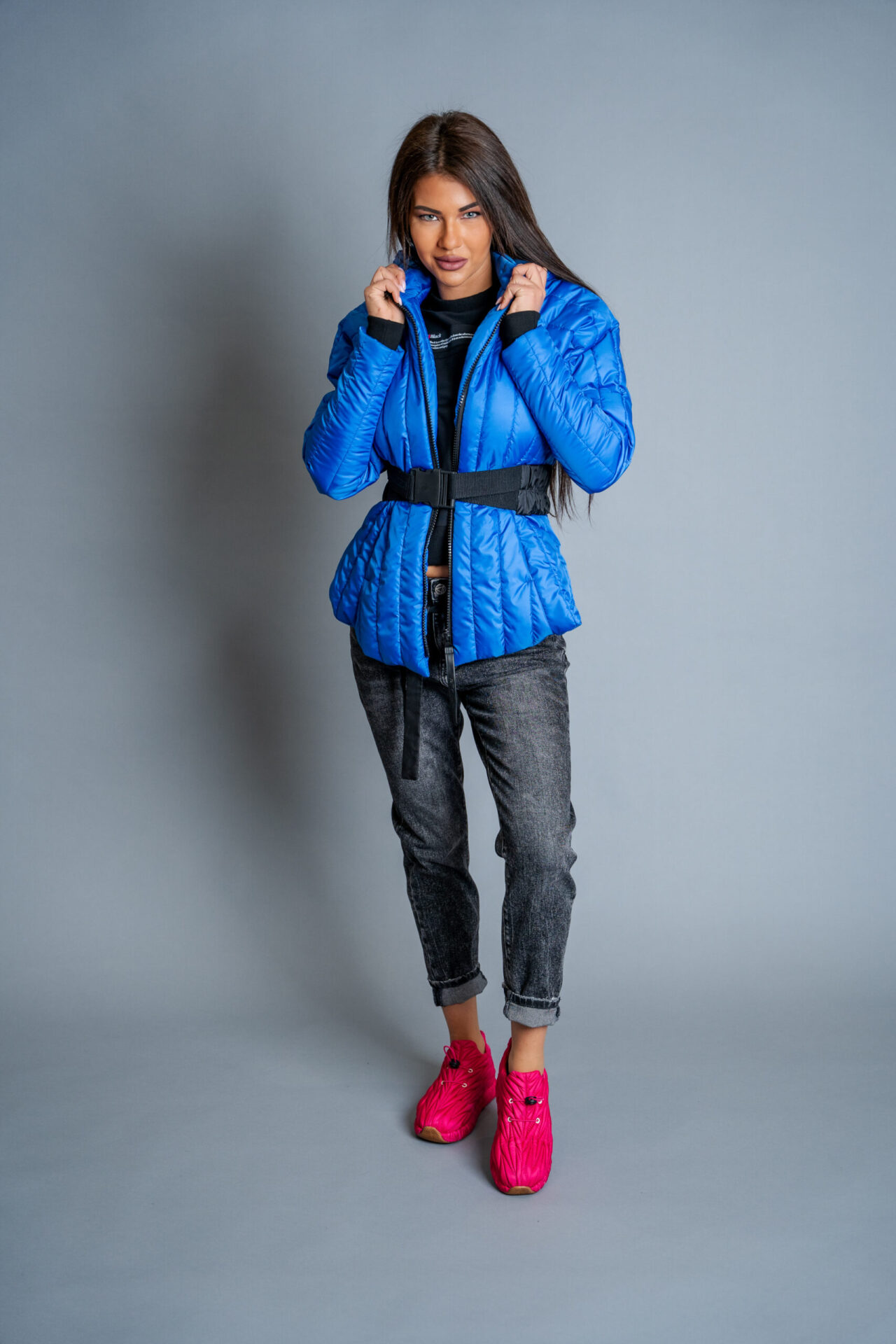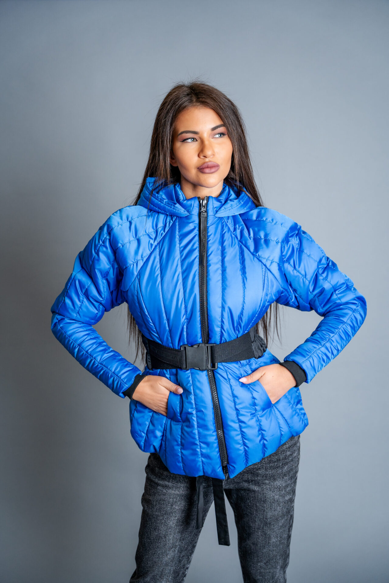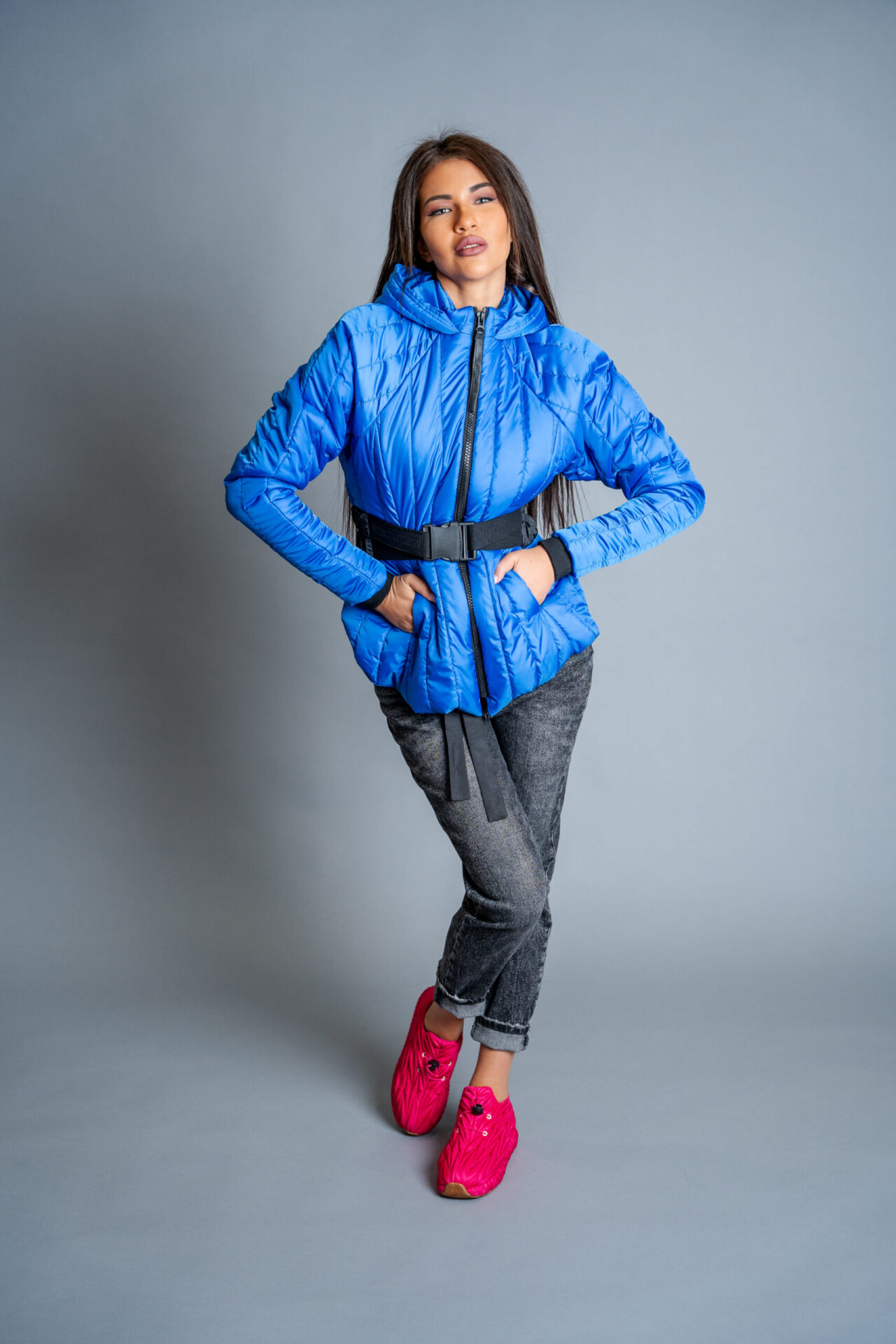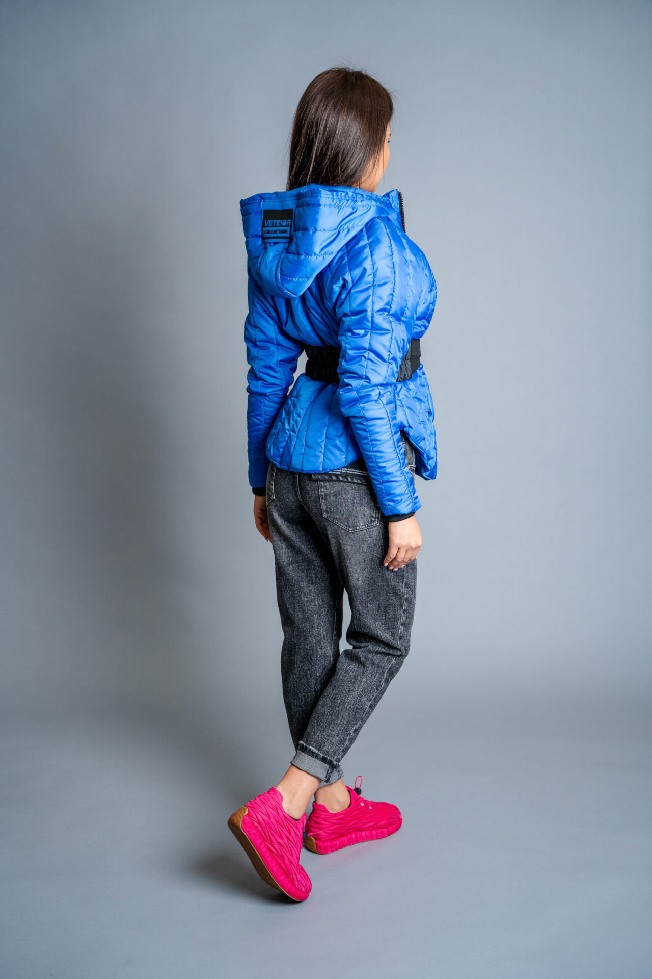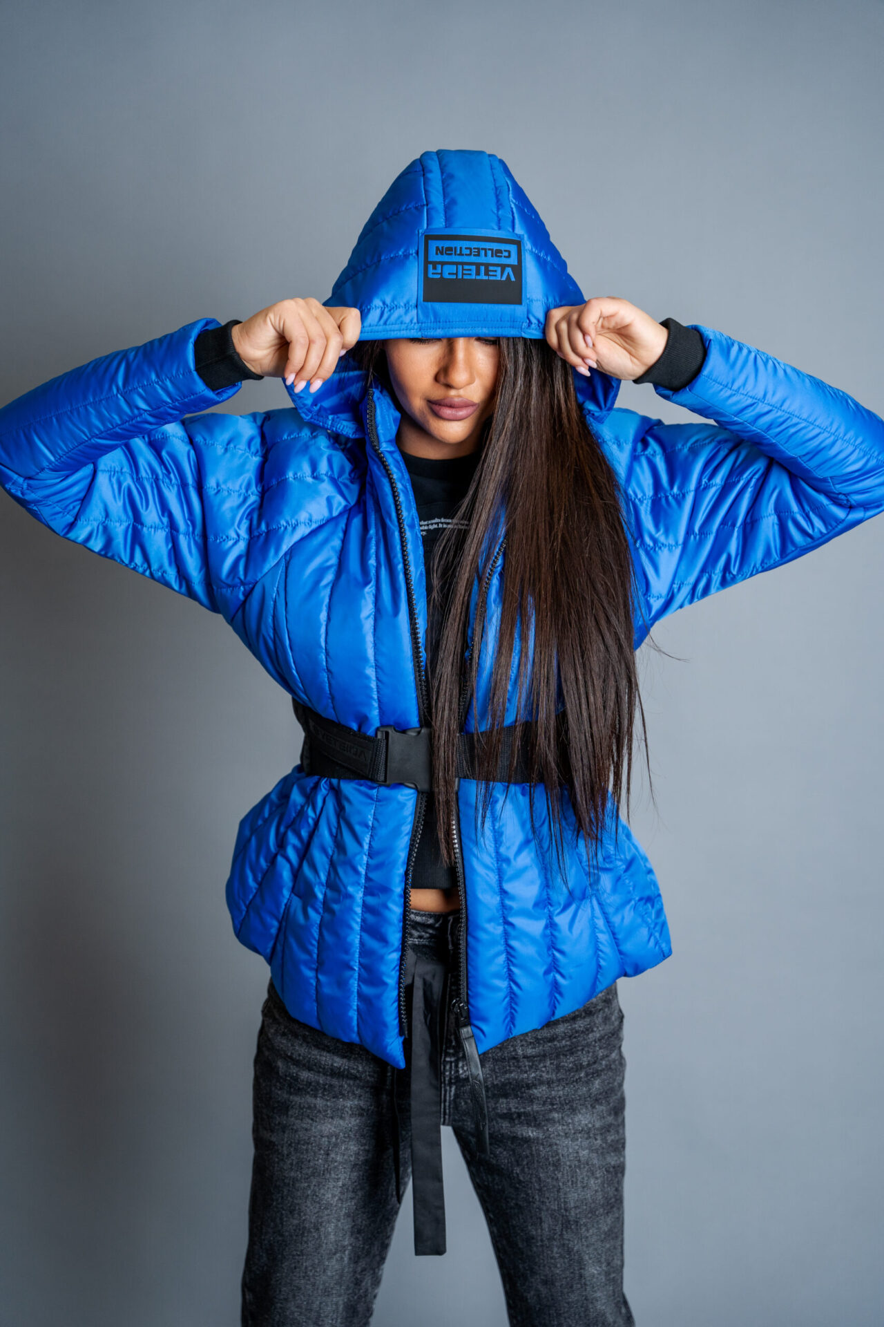 Якето се отличава с голяма качулка, ефектен колан, авторски бранд.