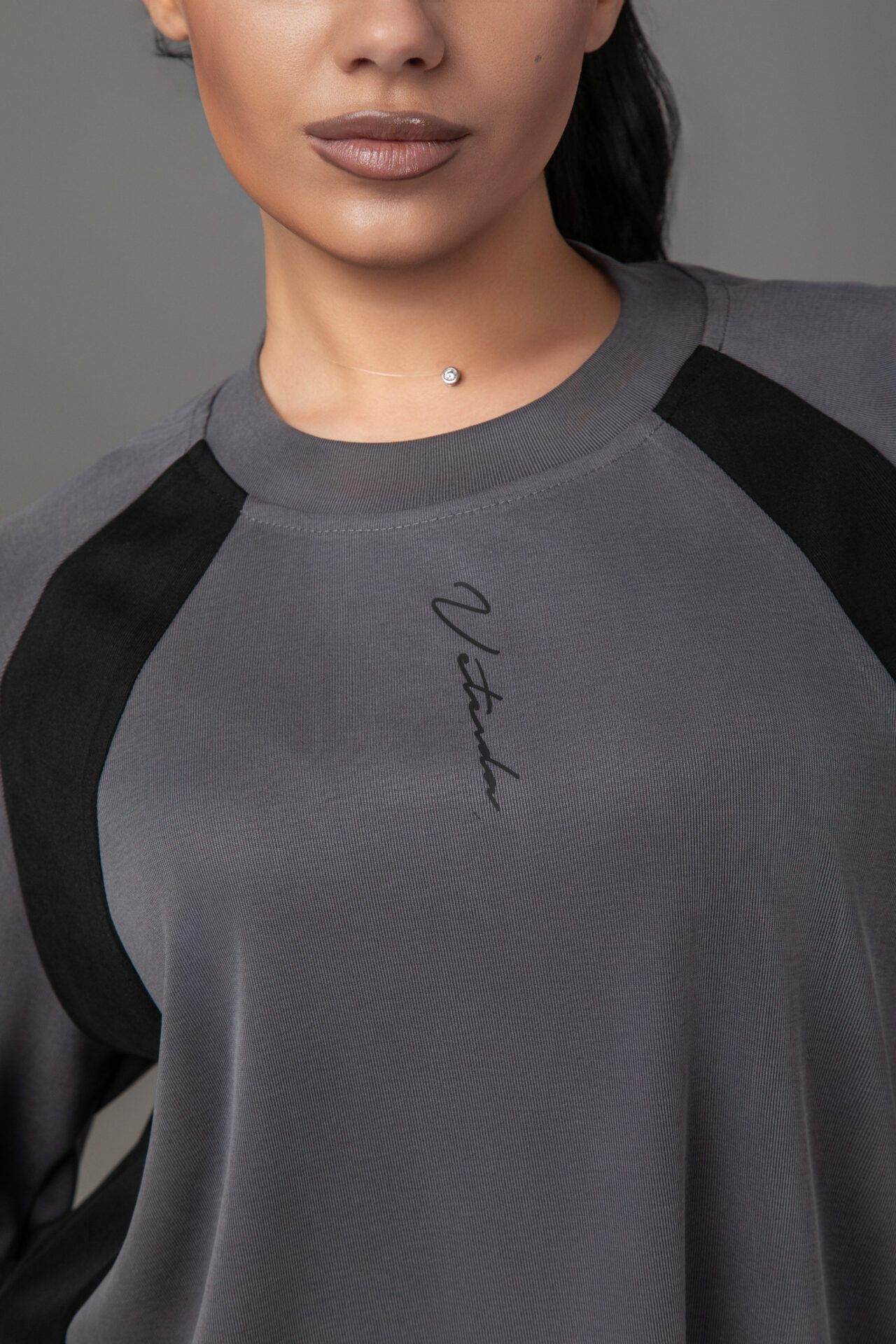 • Контрастът между сивата основа и черните елементи придава модерна градска визия, която лесно се комбинира както със спортни панталони, така и с по-елегантни тоалети.