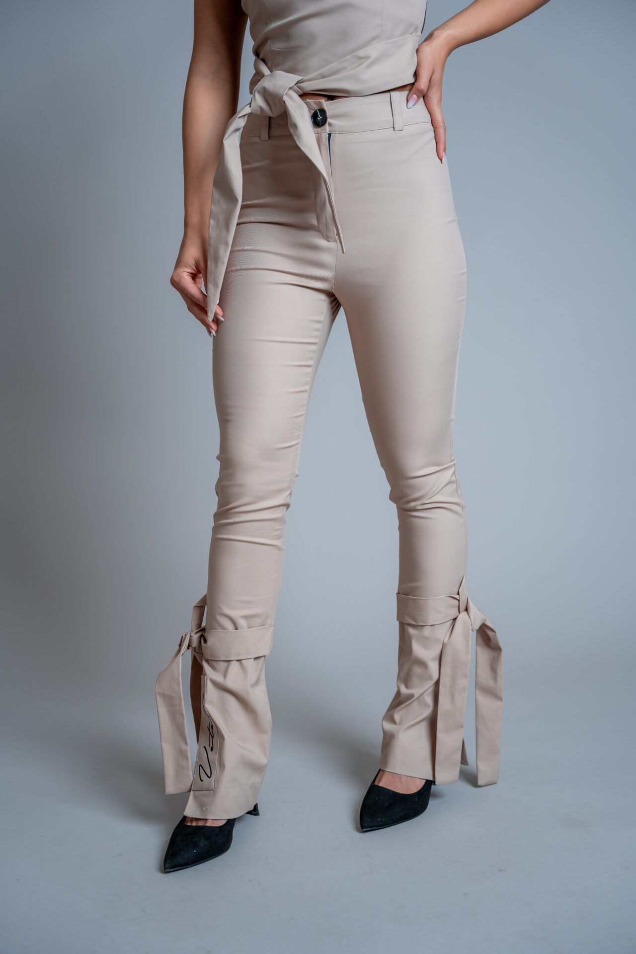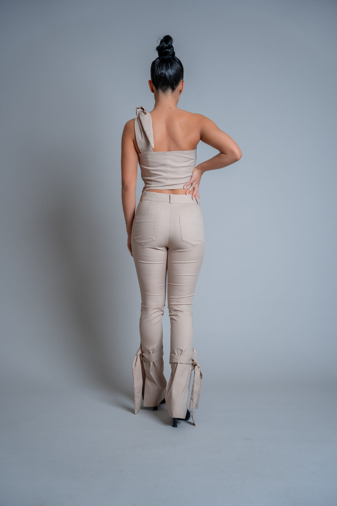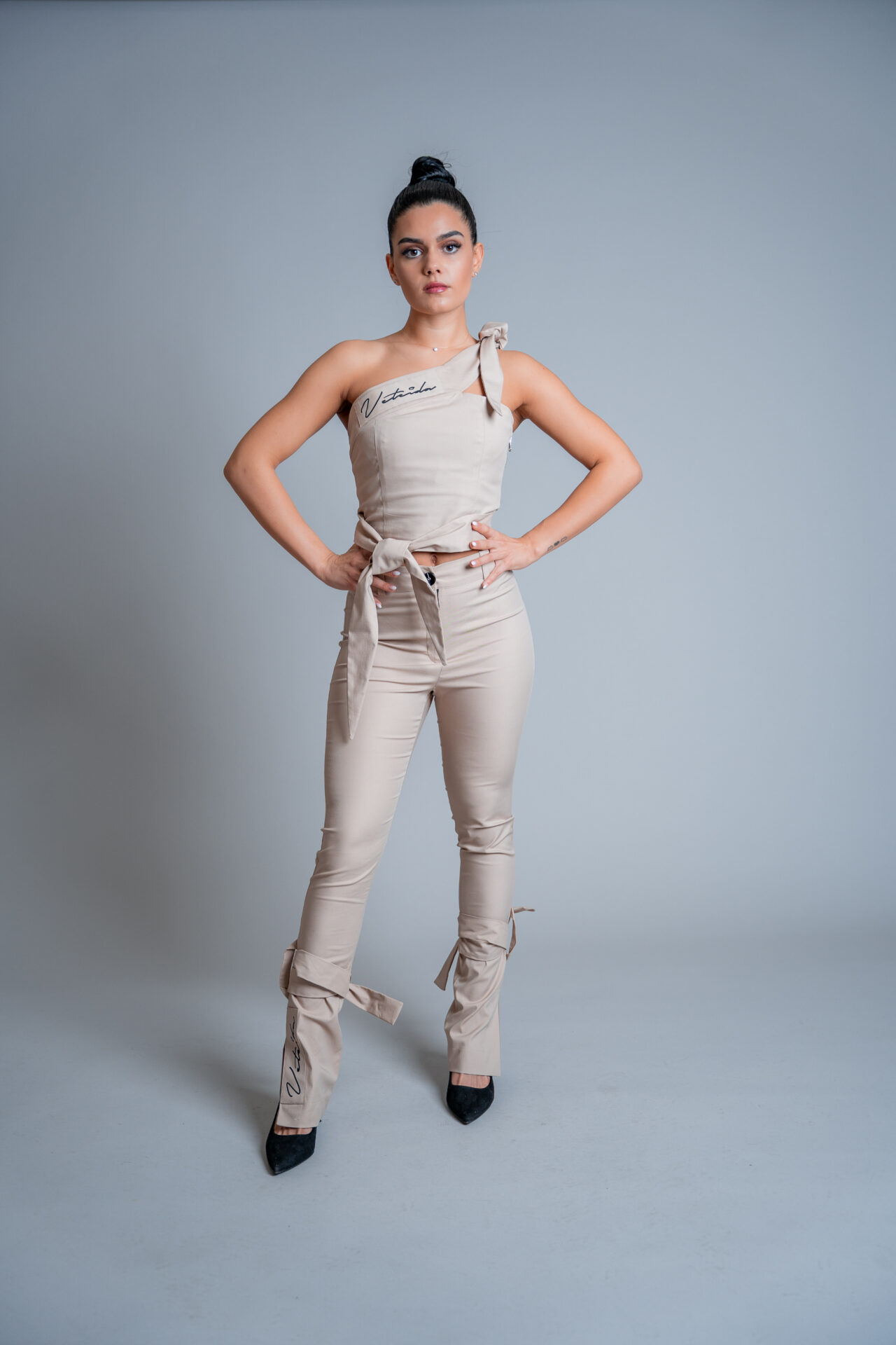 • Модерен комплект от две части – бюстие и панталон с едноцветен десен, подходящ за официални събития.