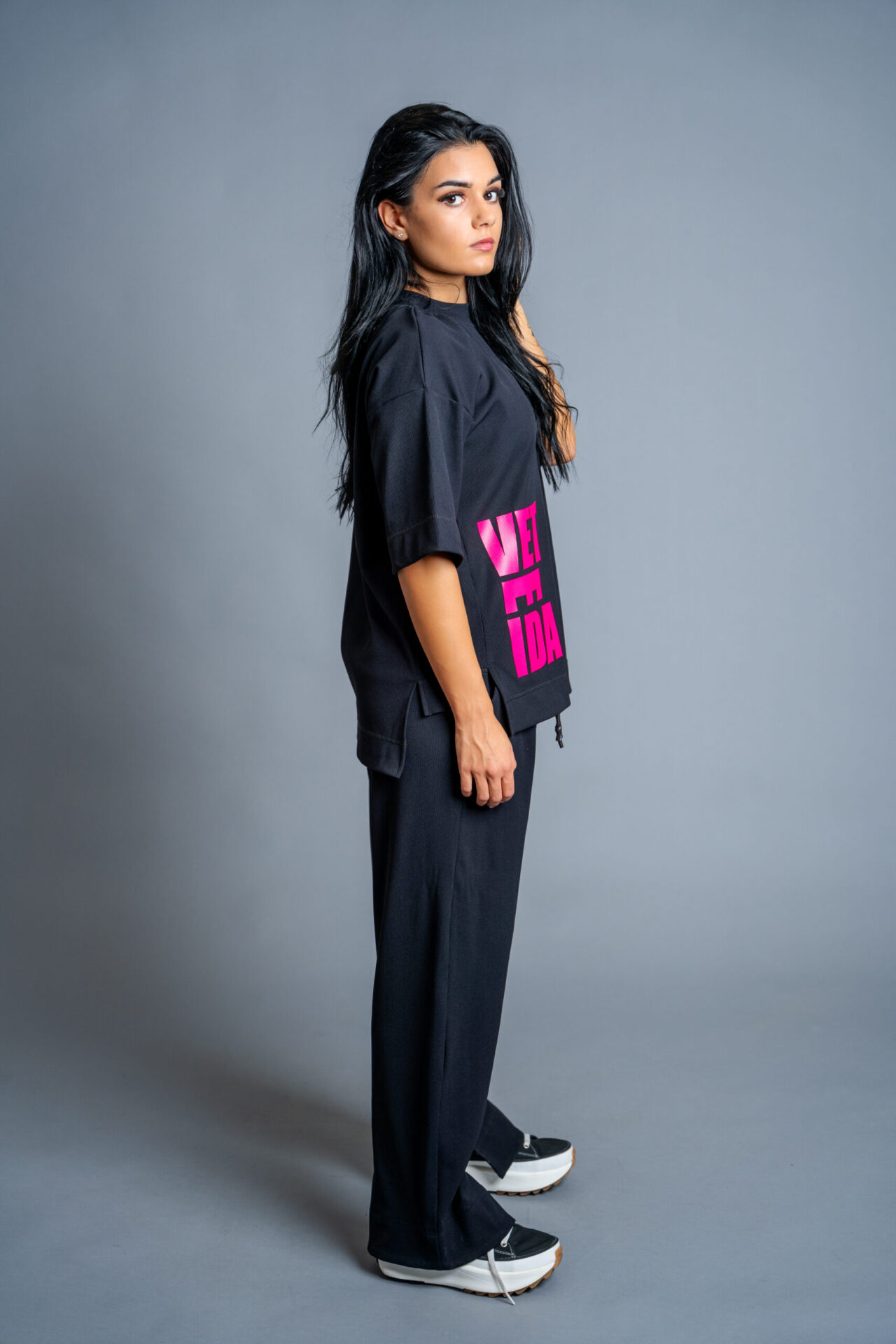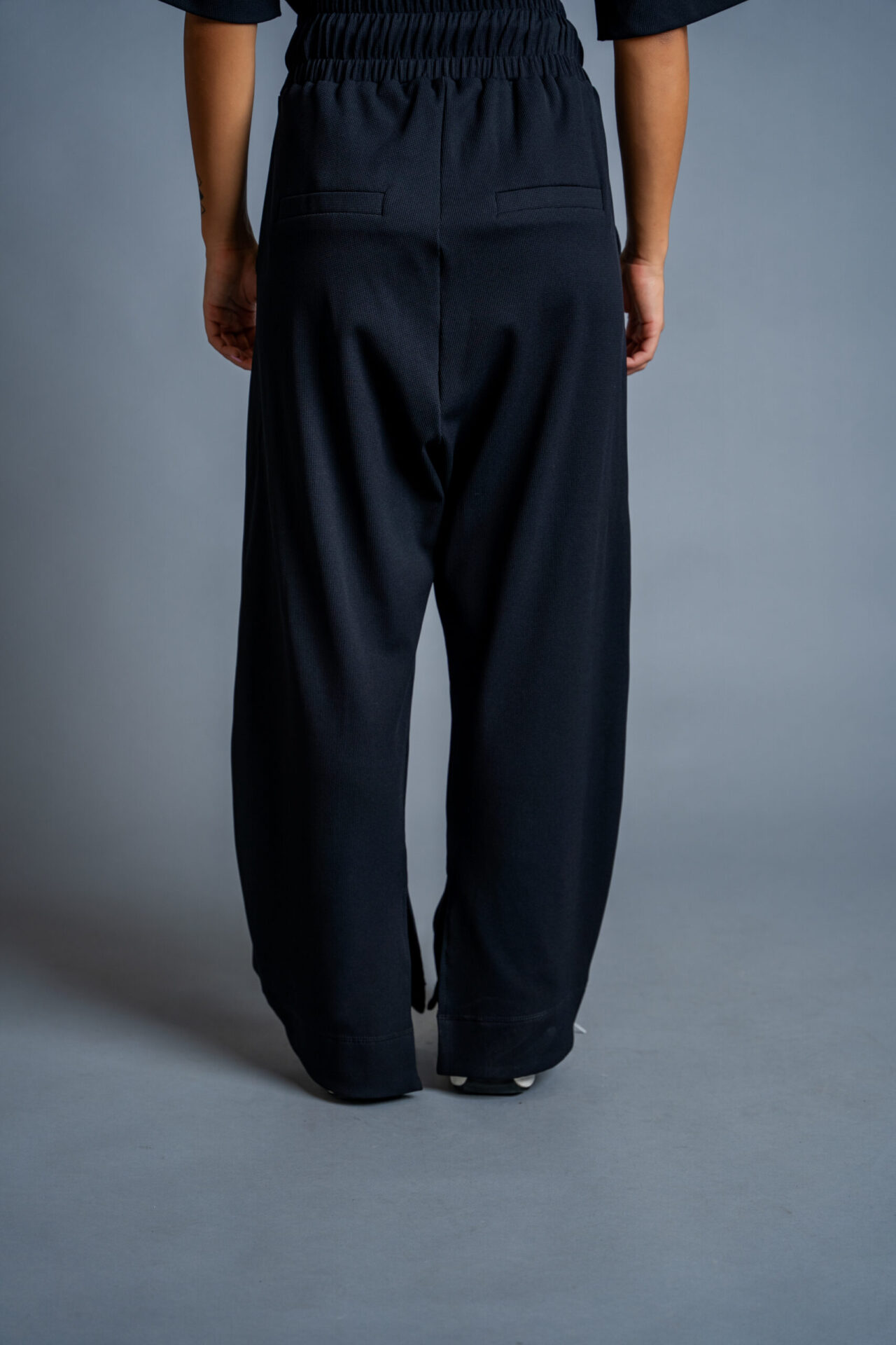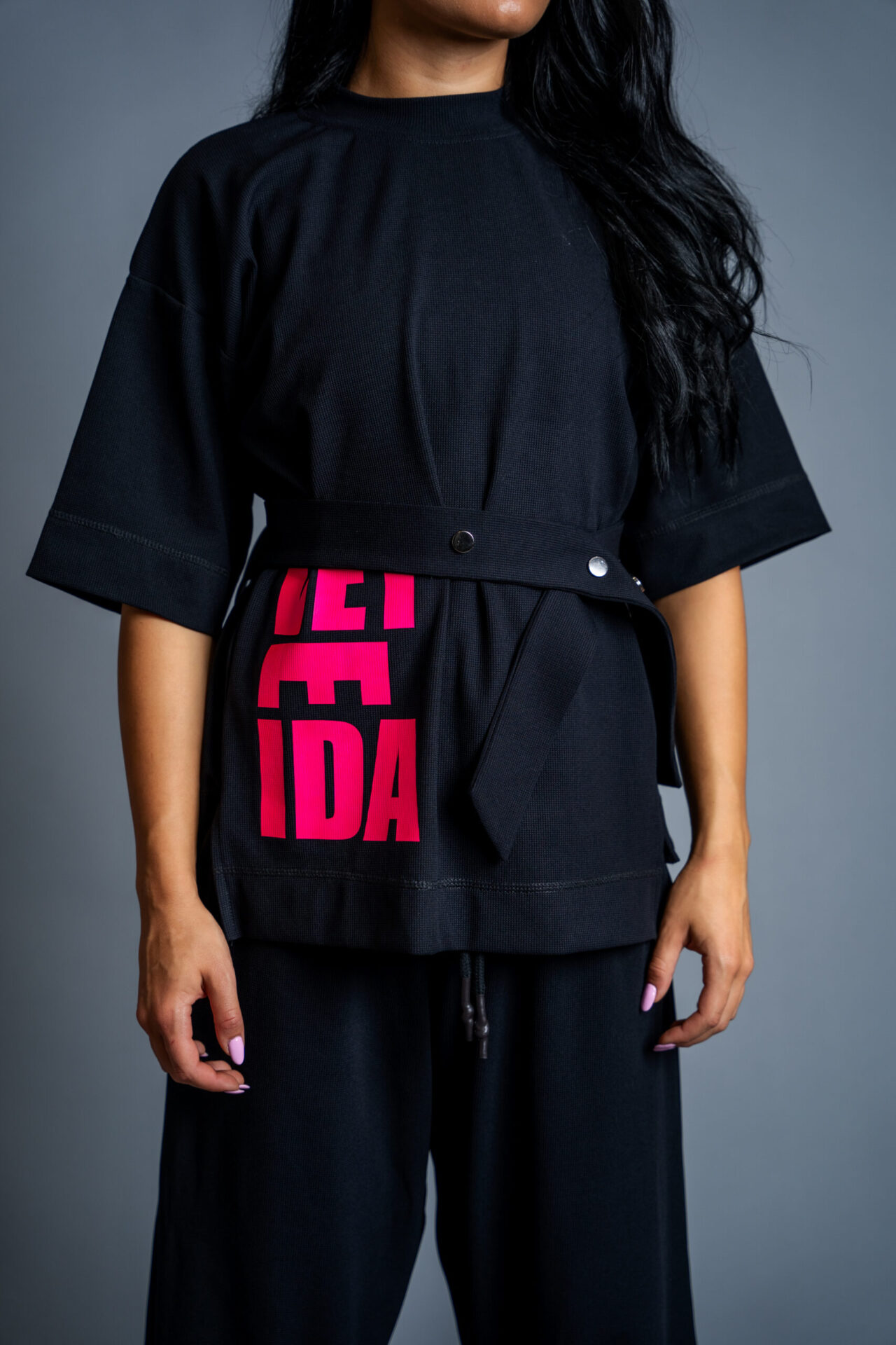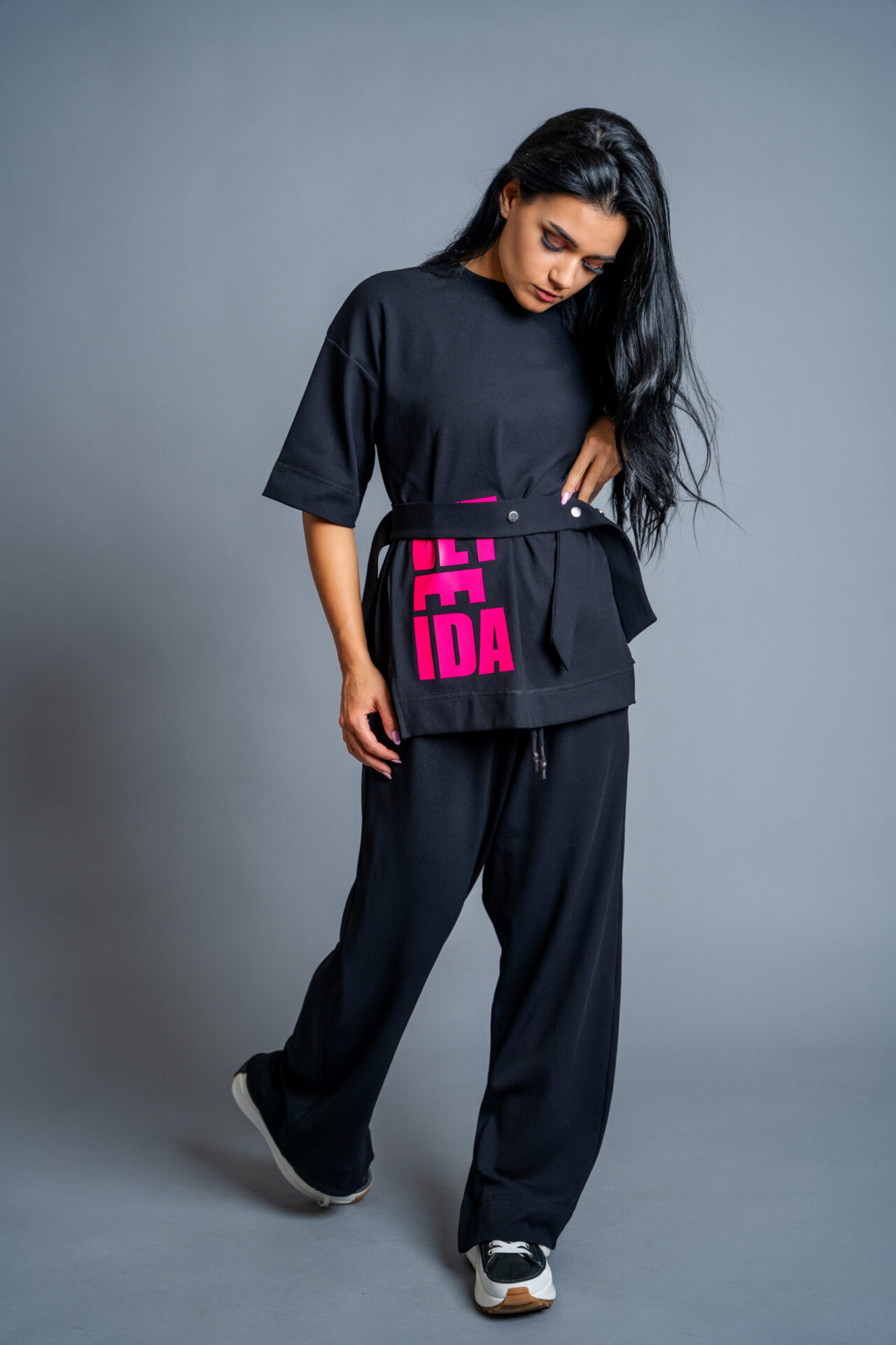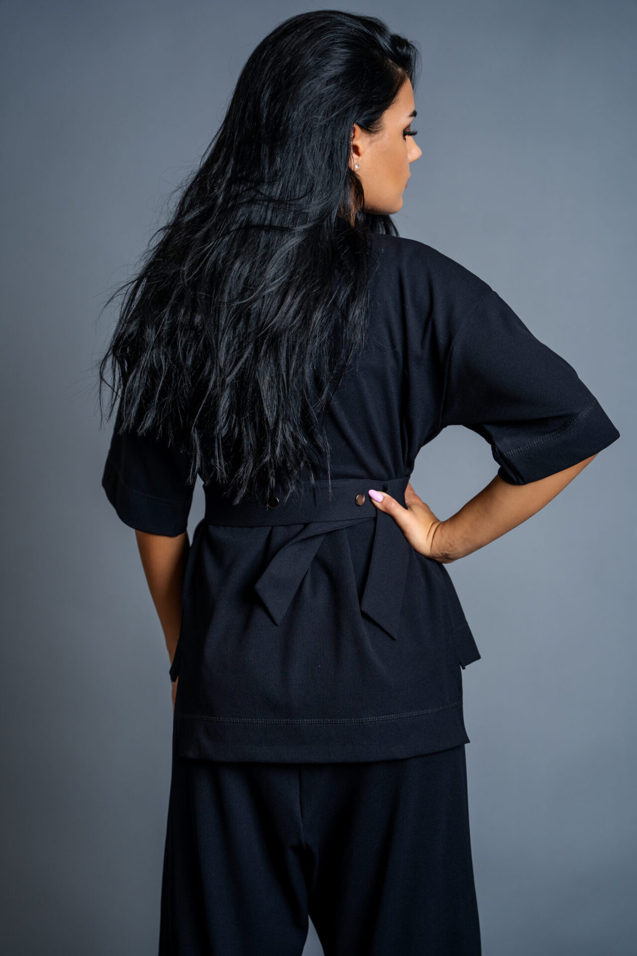 Комплекта се отличава с модерна визия, ефектен колан на талията-крачолите, авторски бранд.
