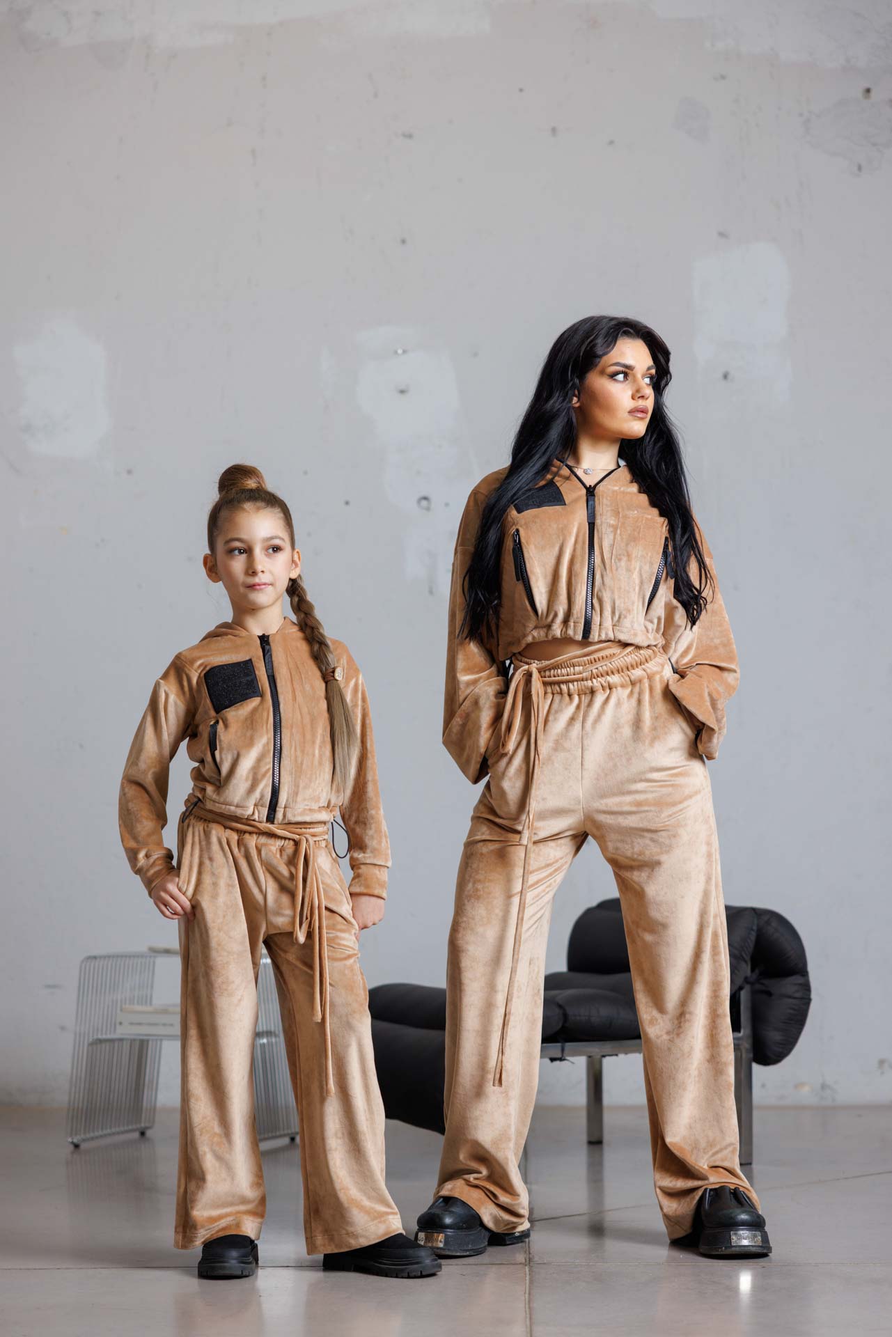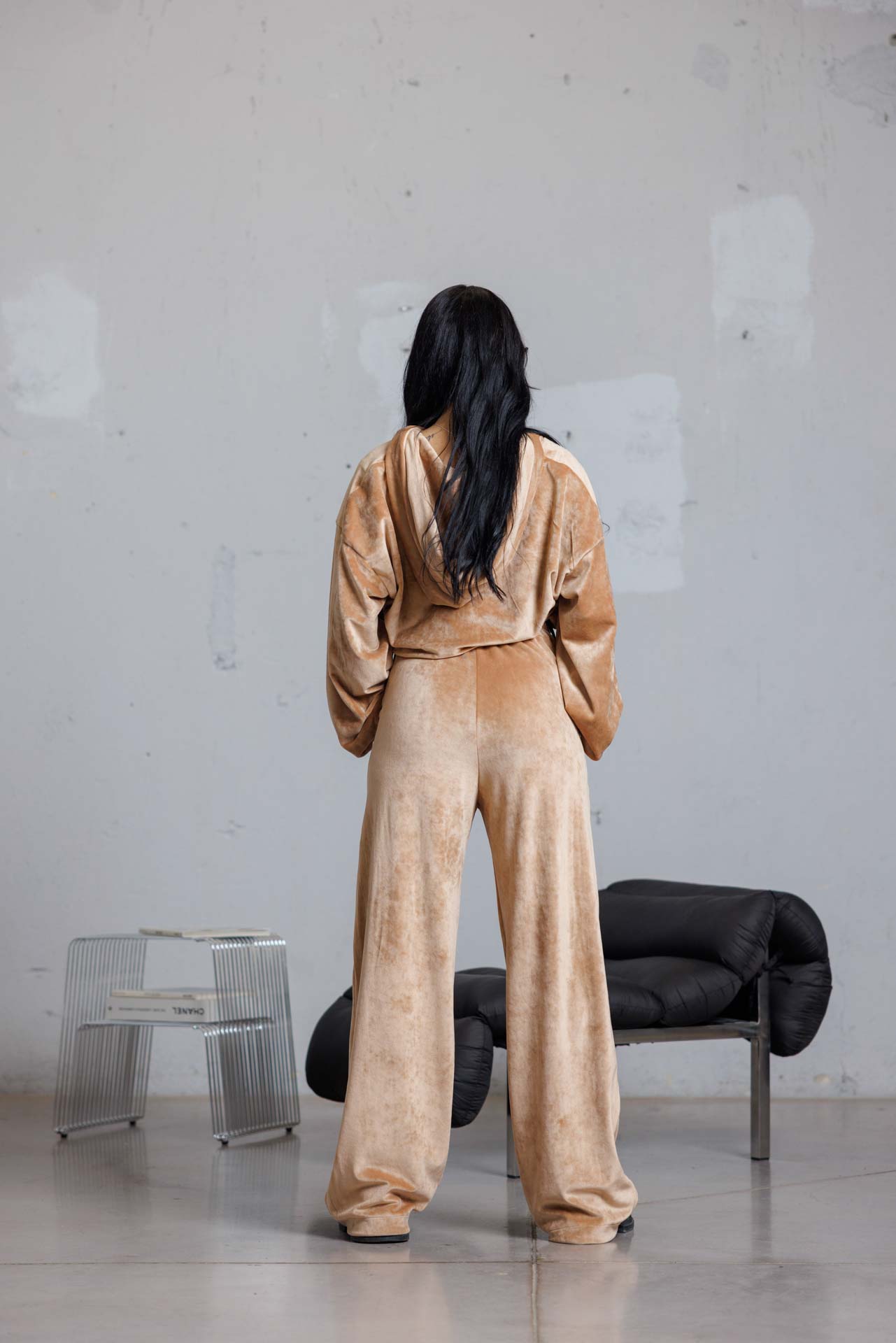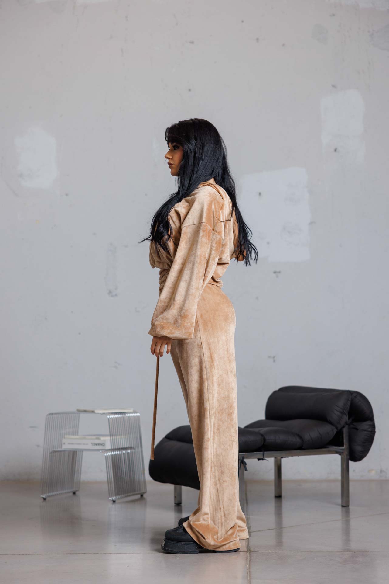 Луксозен комплект от кадифена материя, съчетаващ модерна визия и изключителен комфорт. Свободната кройка, функционалните детайли и подчертана талия правят модела идеален избор за жени, които ценят качествената изработка и уверения стил.