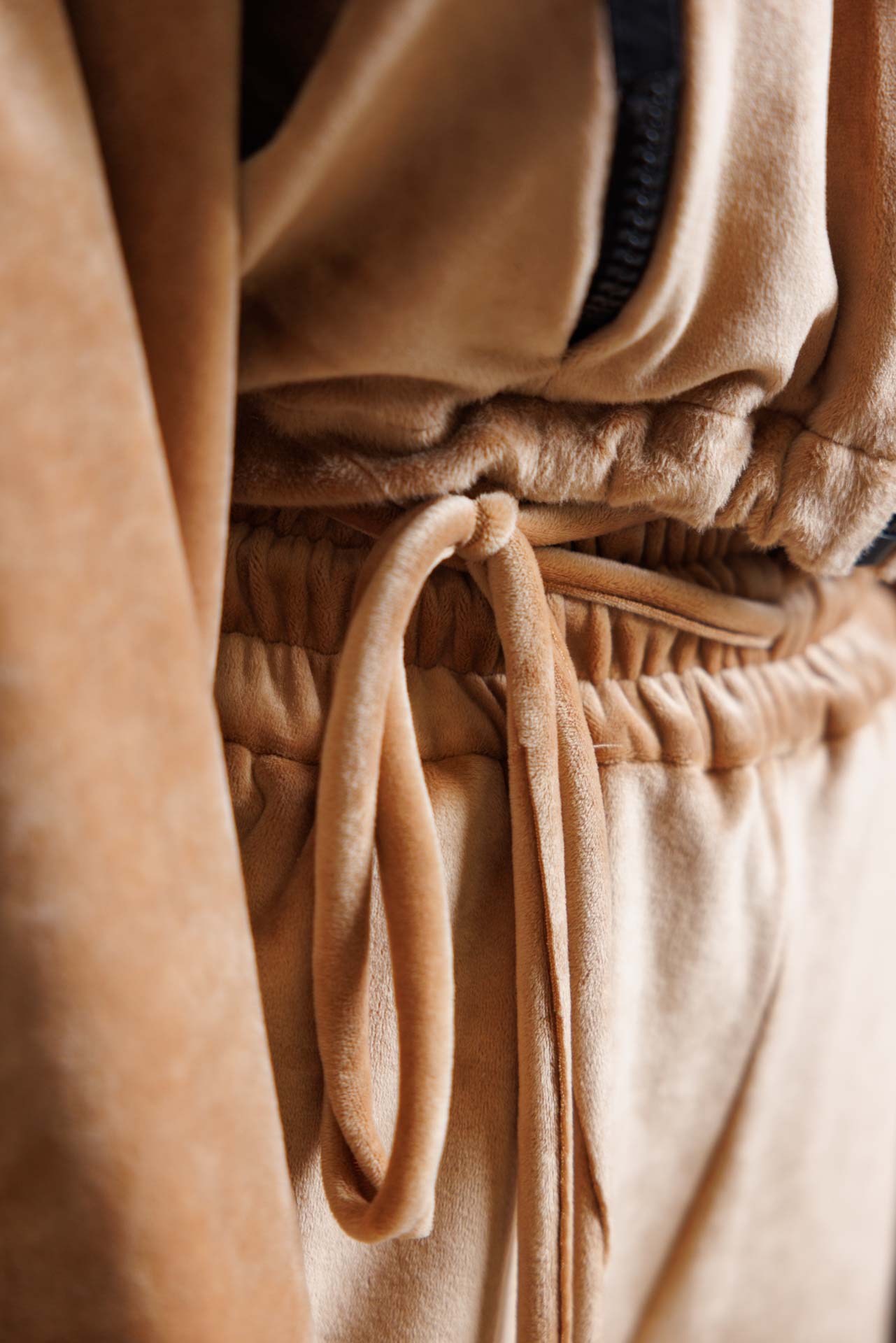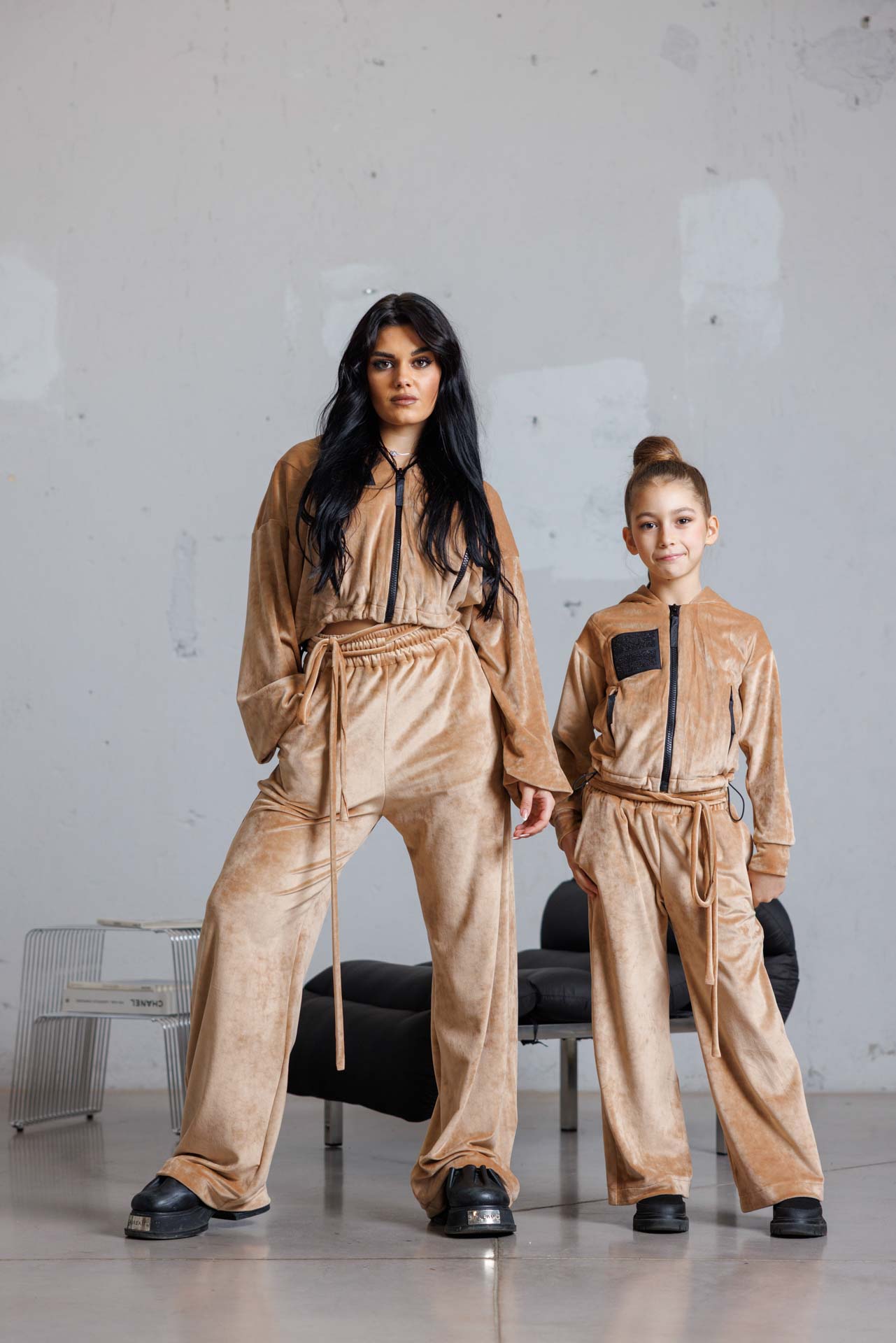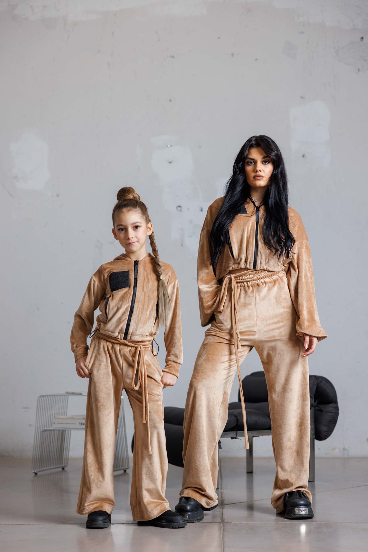 Луксозен комплект от кадифена материя, съчетаващ модерна визия и изключителен комфорт. Свободната кройка, функционалните детайли и подчертана талия правят модела идеален избор за жени, които ценят качествената изработка и уверения стил.