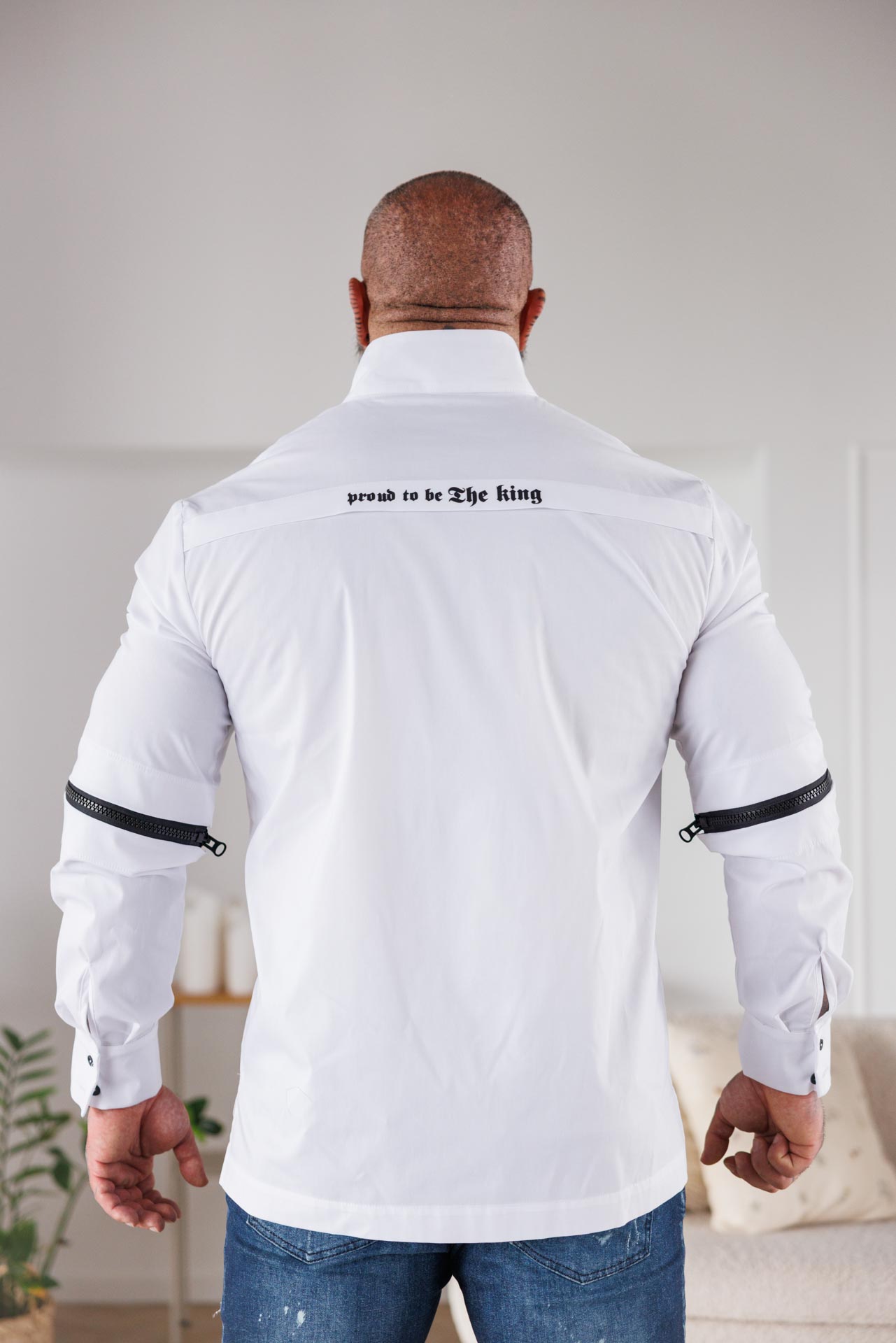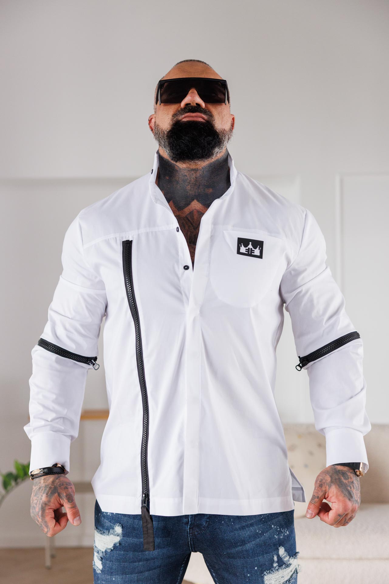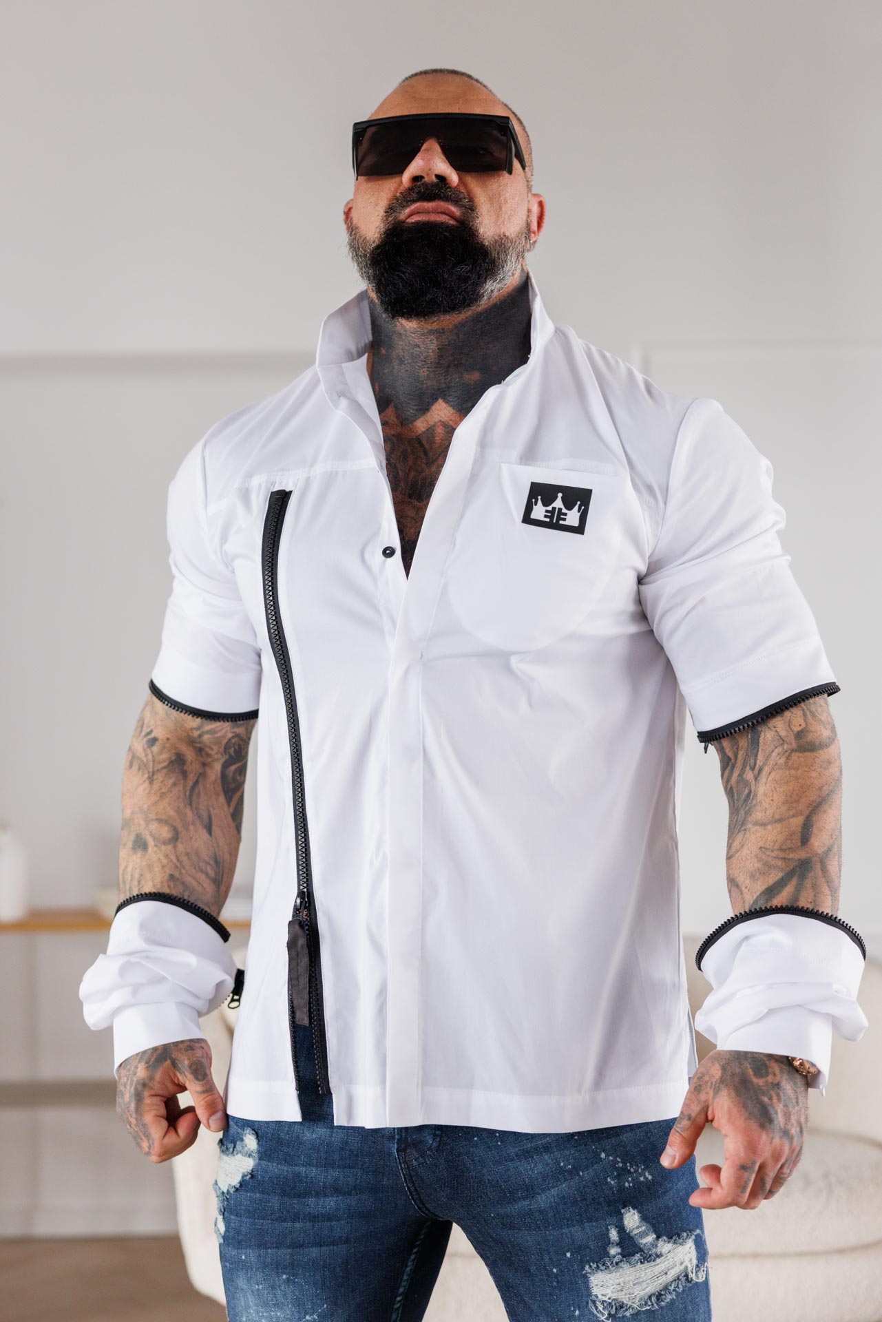 Изчистена визия с неочакван детайл – бялата риза “The king” комбинира класиката на памучната материя с модерната визия на цип и падащи ръкави.