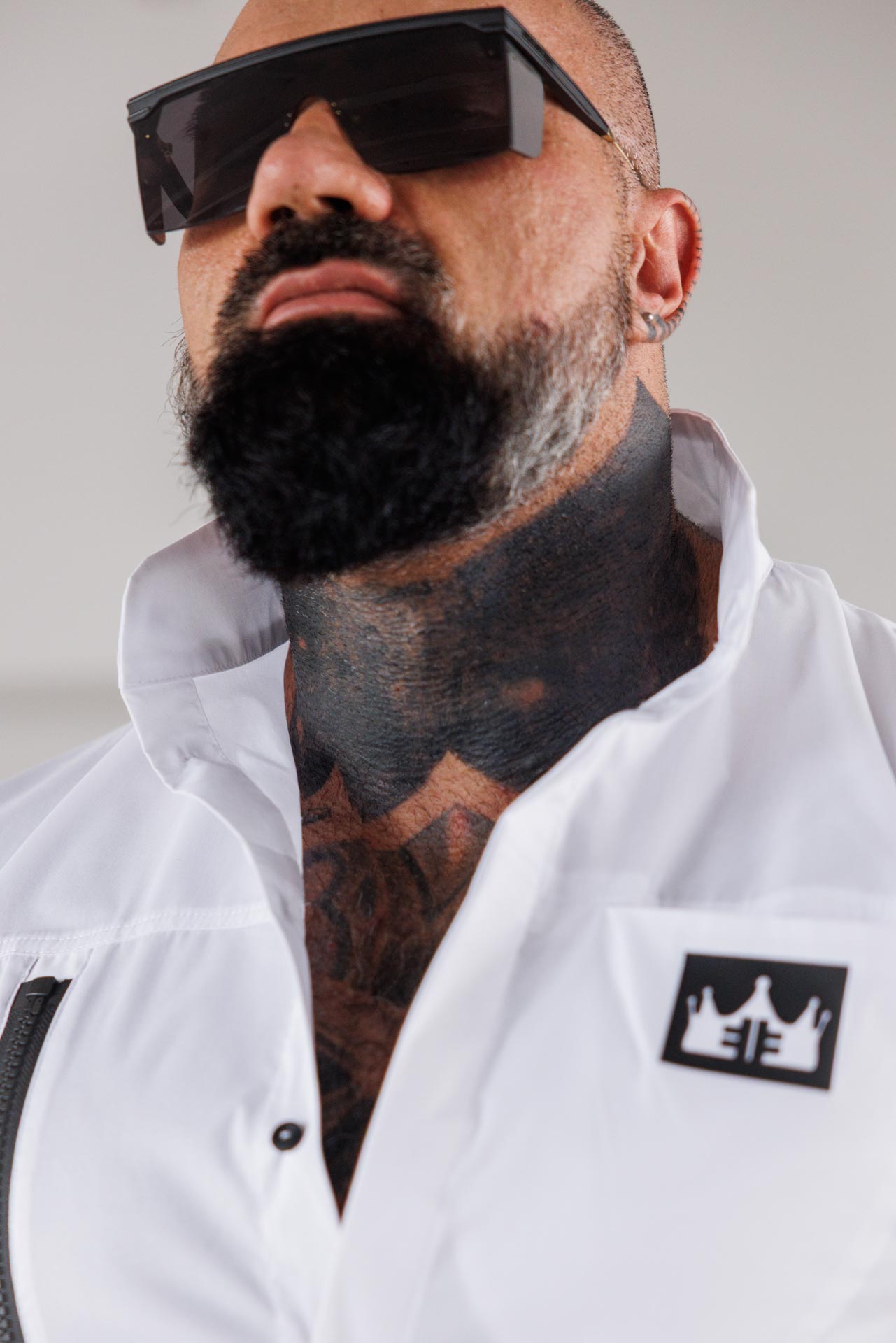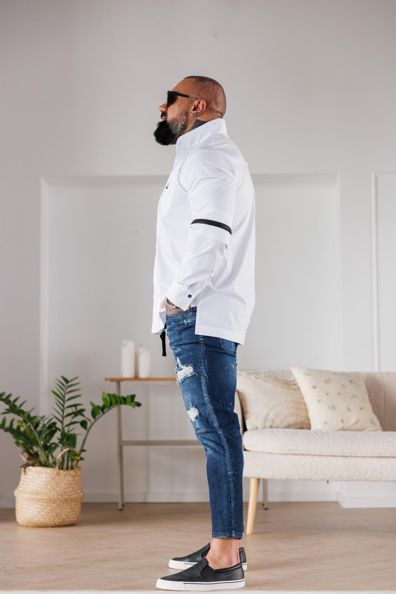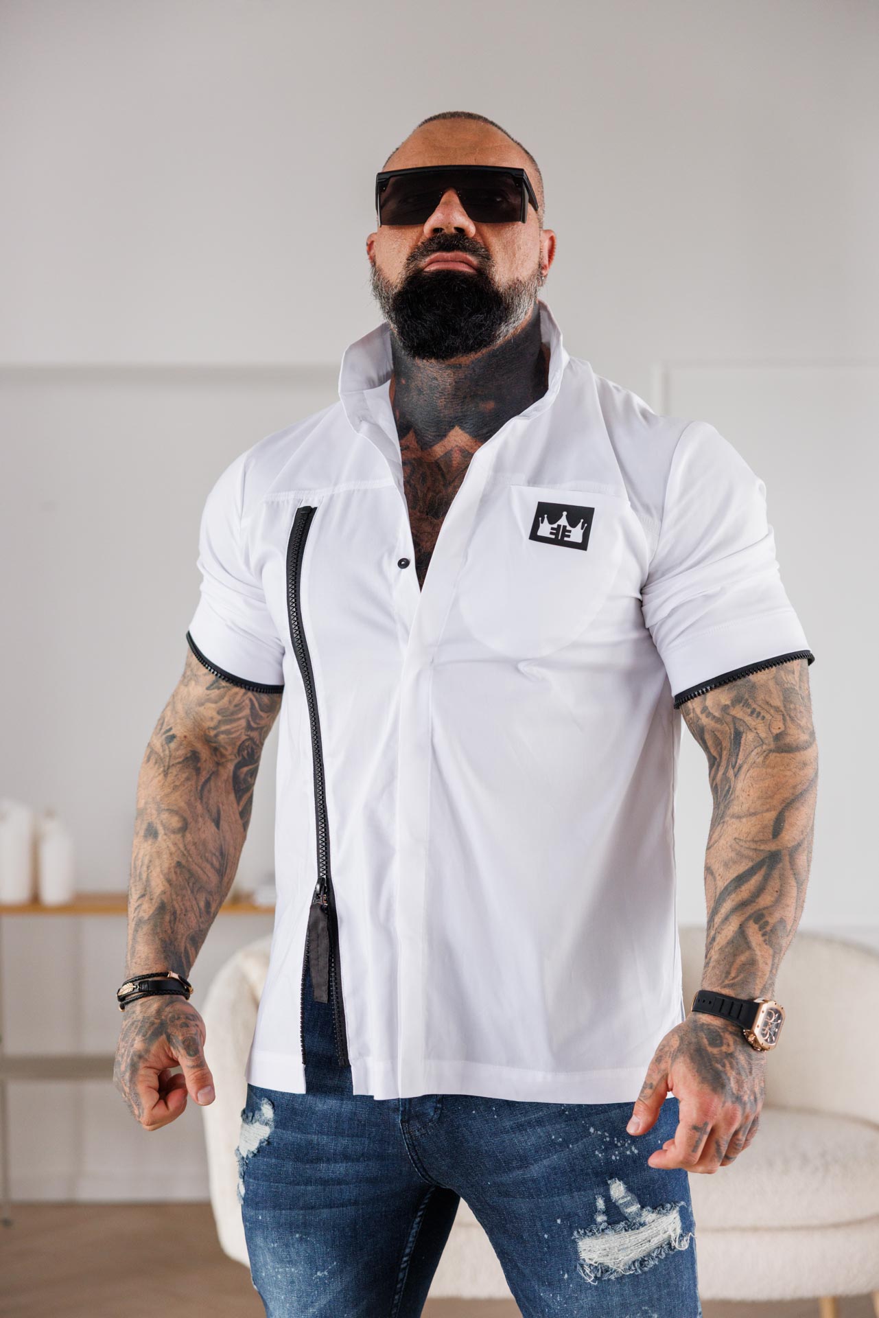 Изчистена визия с неочакван детайл – бялата риза “The king” комбинира класиката на памучната материя с модерната визия на цип и падащи ръкави.