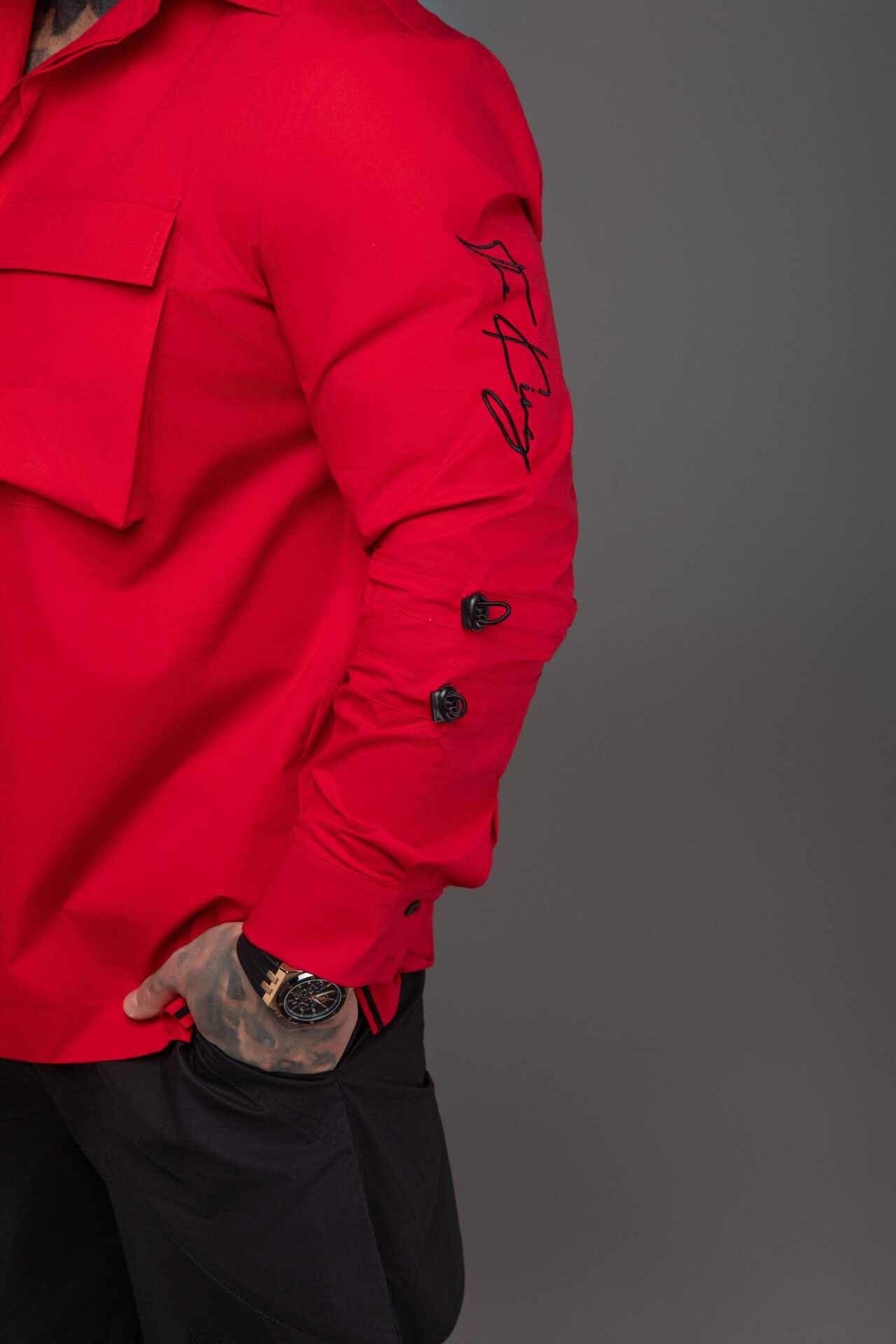 • Акцентът е завършен с контрастна червена бродерия върху ръкава – подпис на модела, който добавя индивидуалност и отличителен характер.