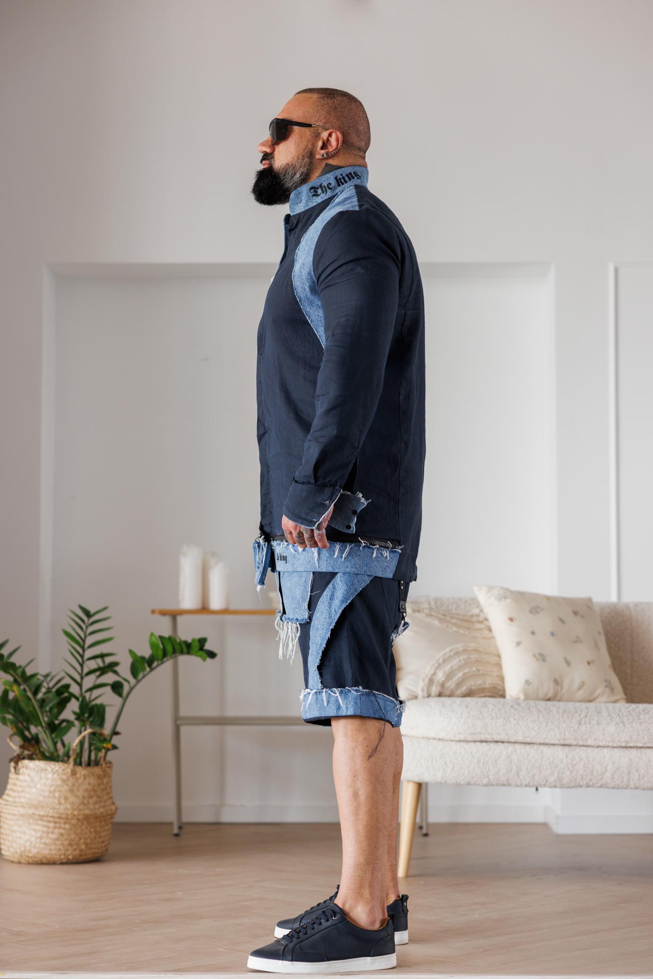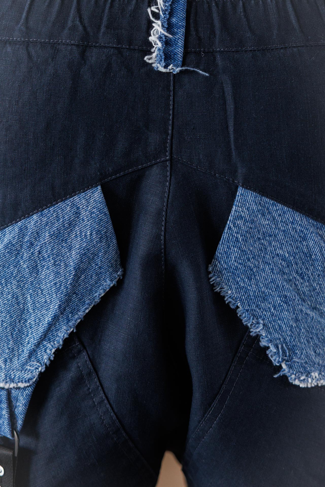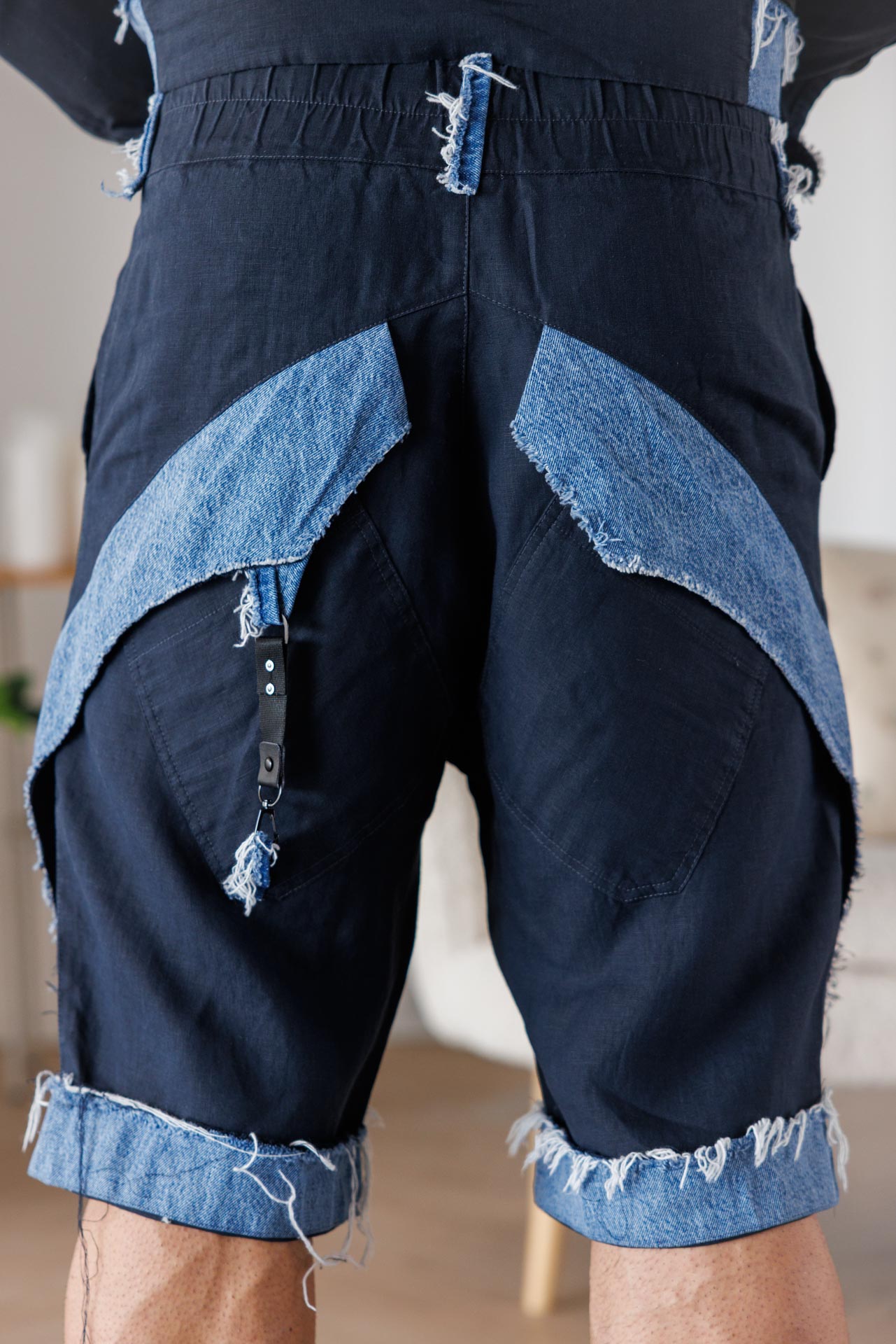 • Този модел къси панталони впечатлява със съвременно и дръзко излъчване, съчетавайки стилен тъмен плат с контрастни деним елементи и ефектно изтъркан финиш.