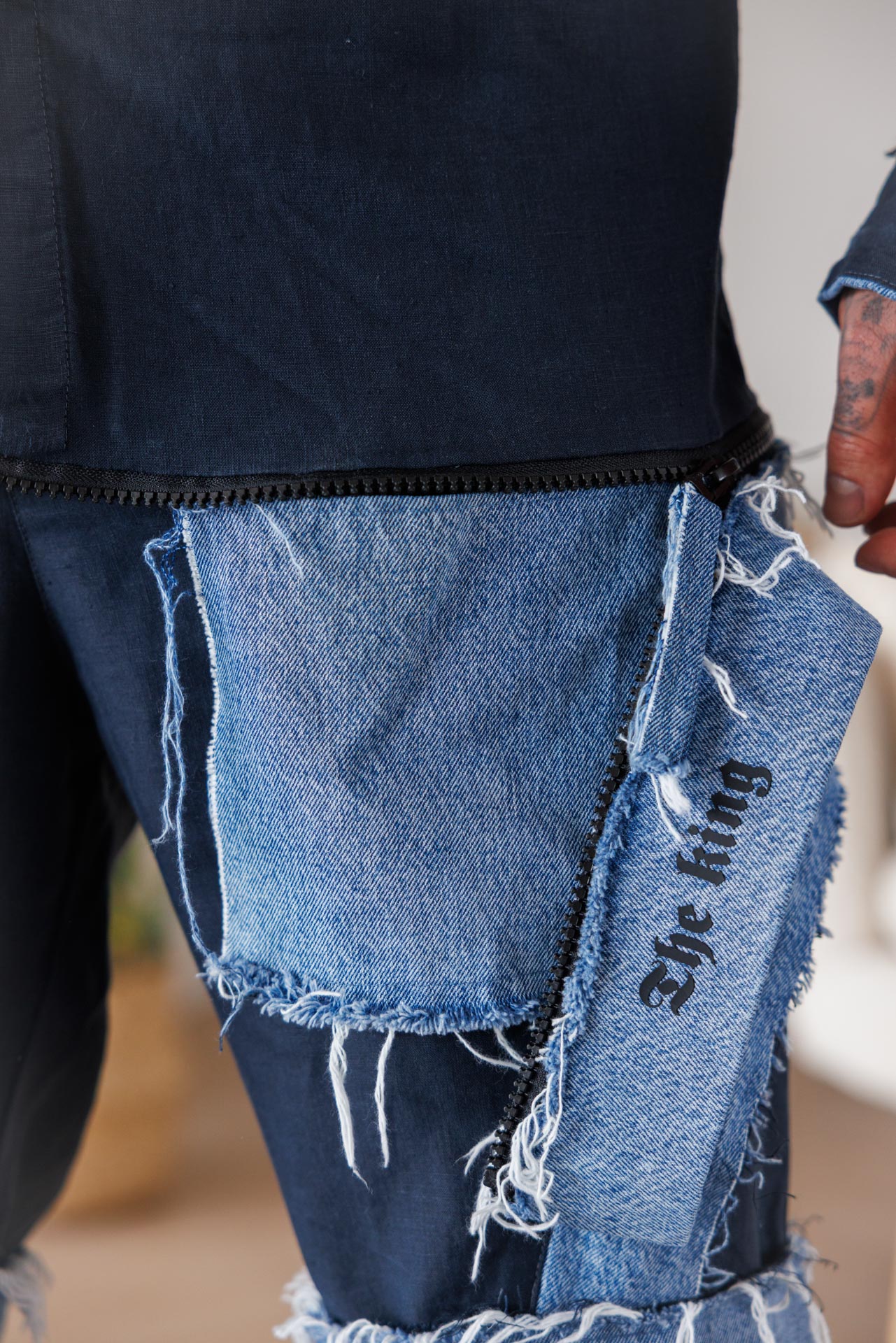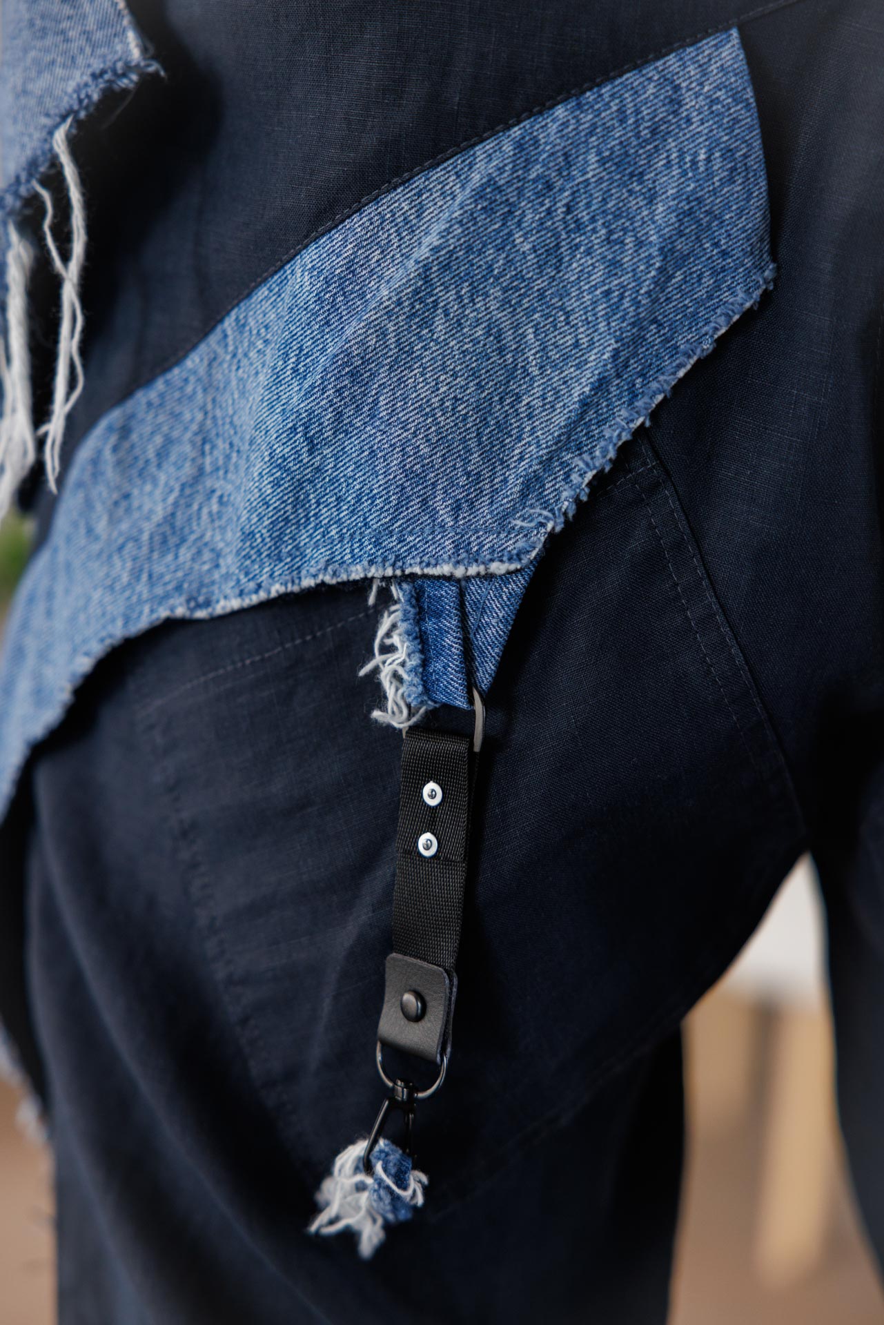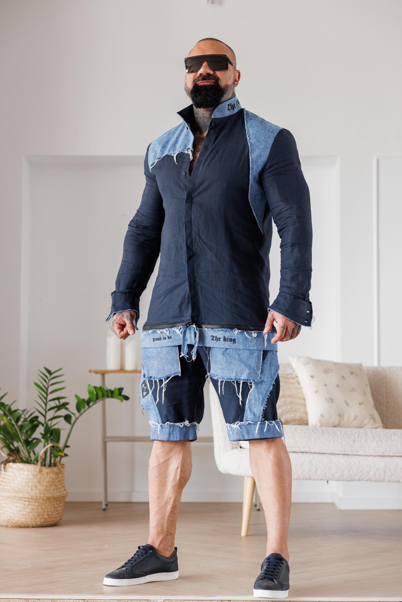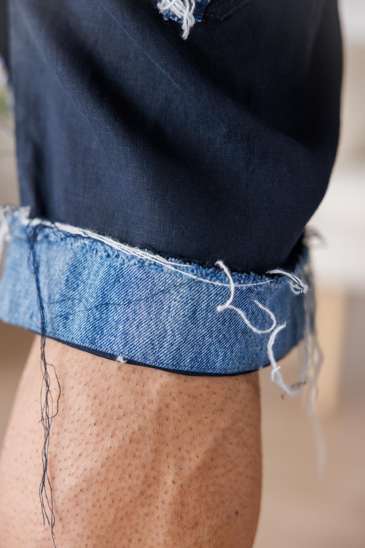 • Този модел къси панталони впечатлява със съвременно и дръзко излъчване, съчетавайки стилен тъмен плат с контрастни деним елементи и ефектно изтъркан финиш.