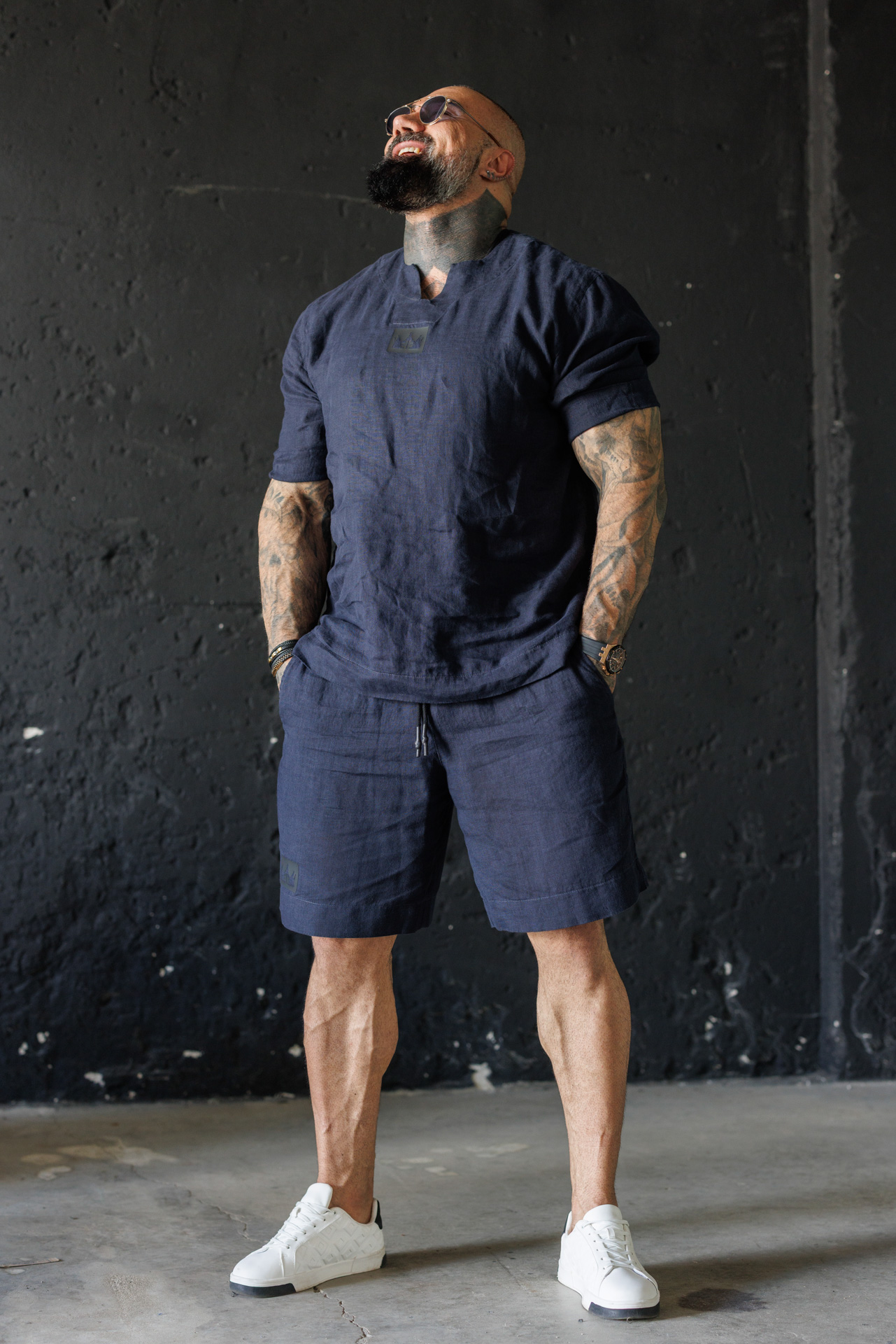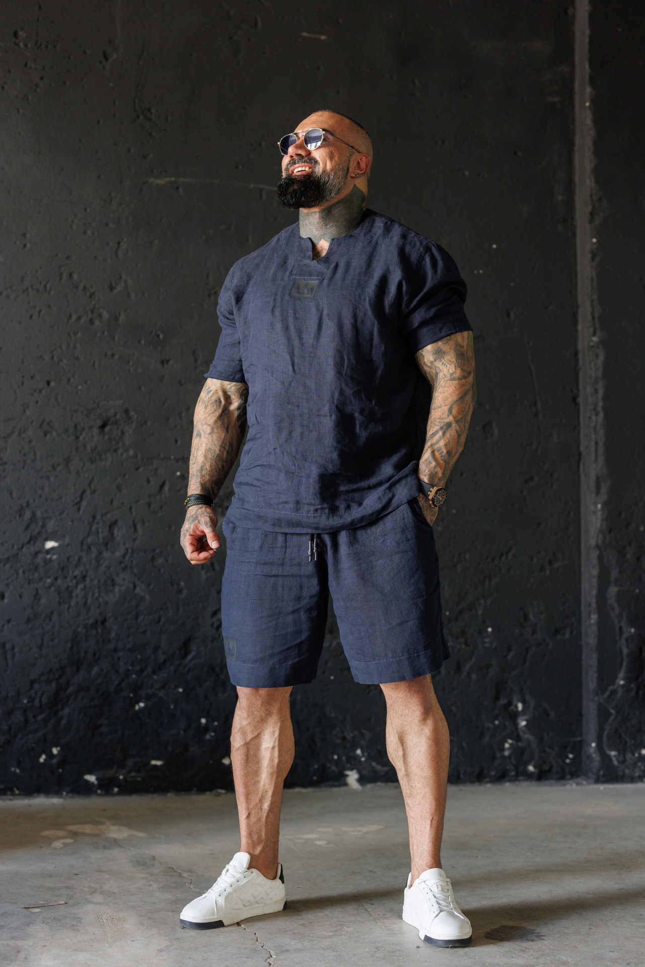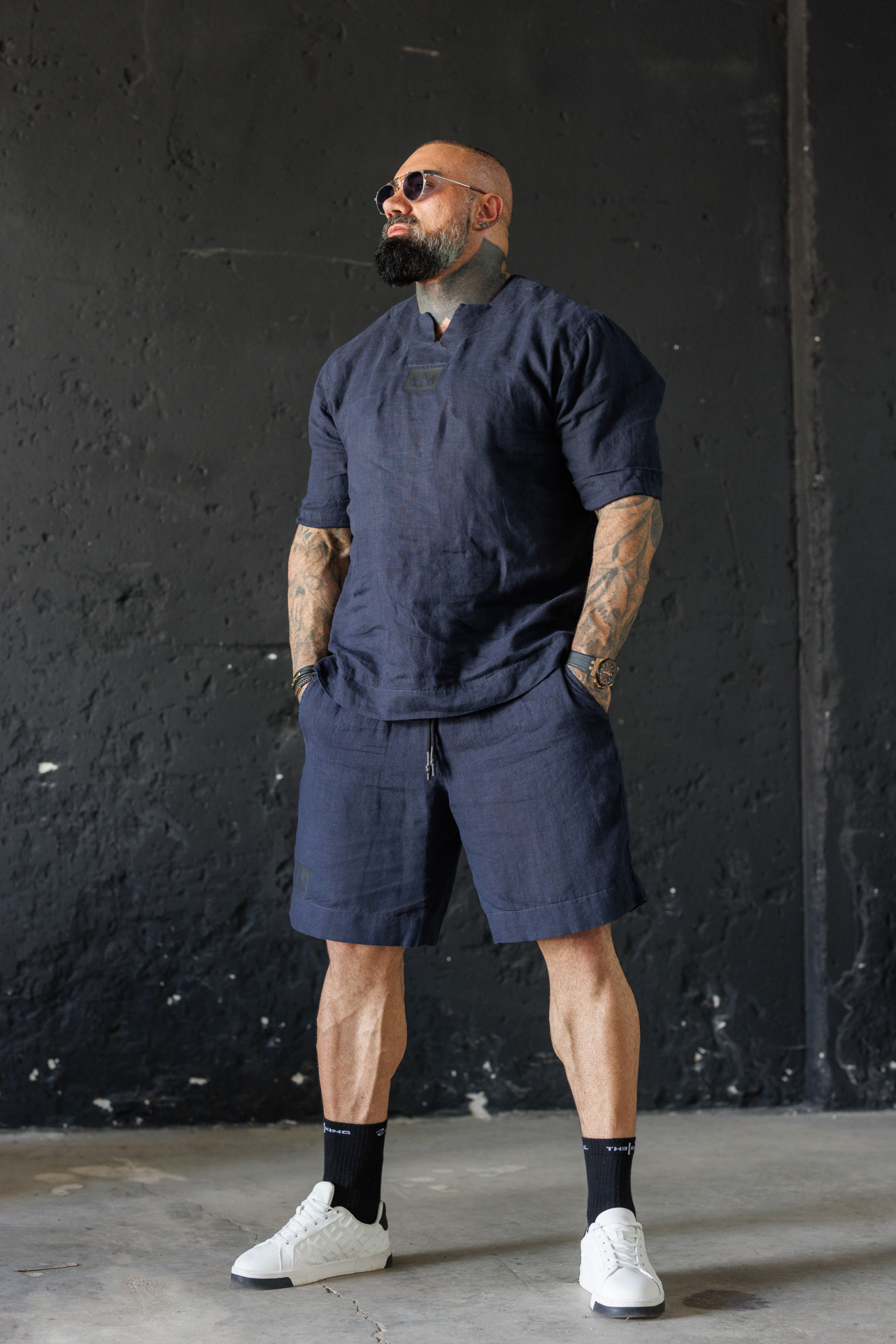 Потопи се в летния комфорт с този елегантен мъжки комплект от лен в класически син цвят.