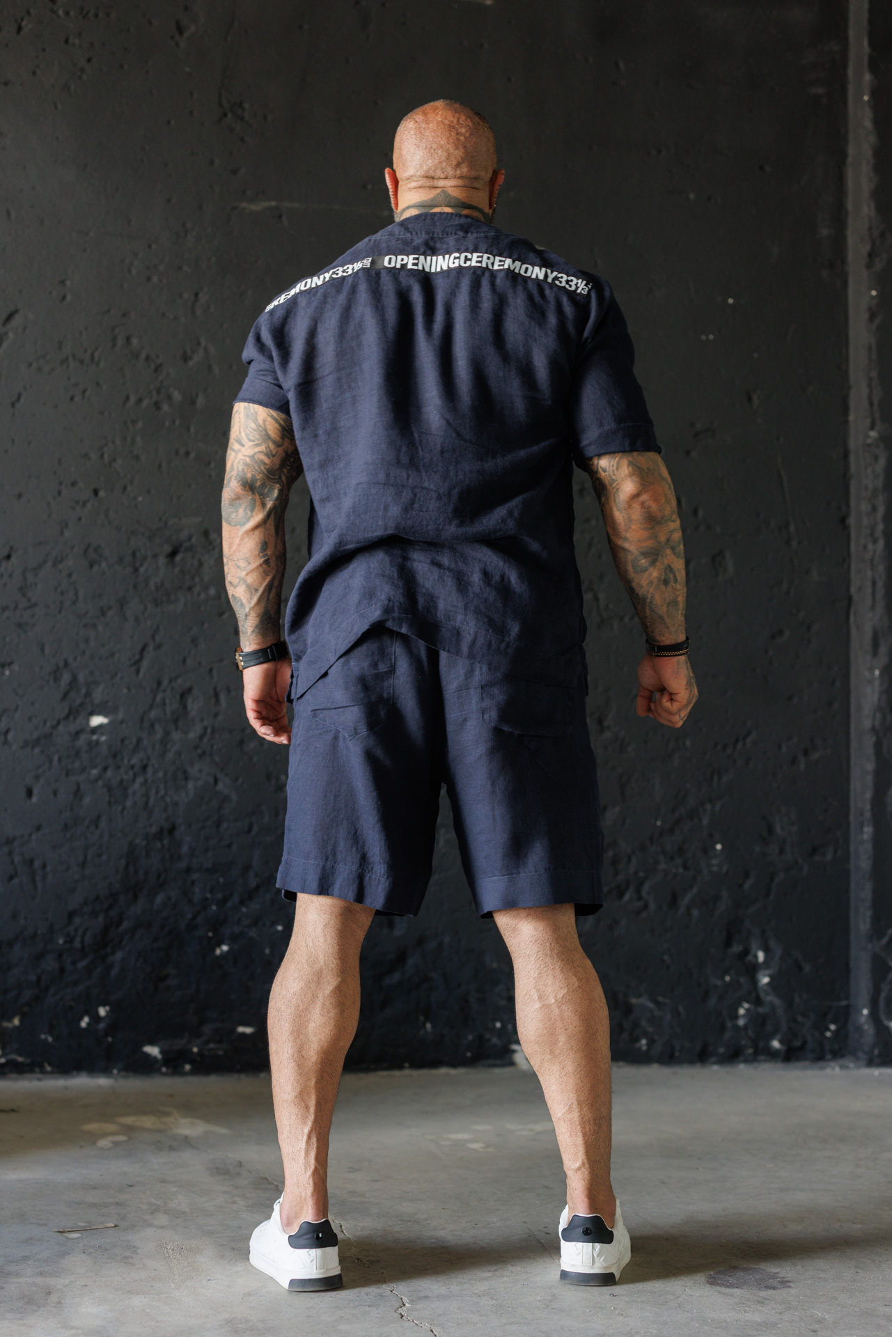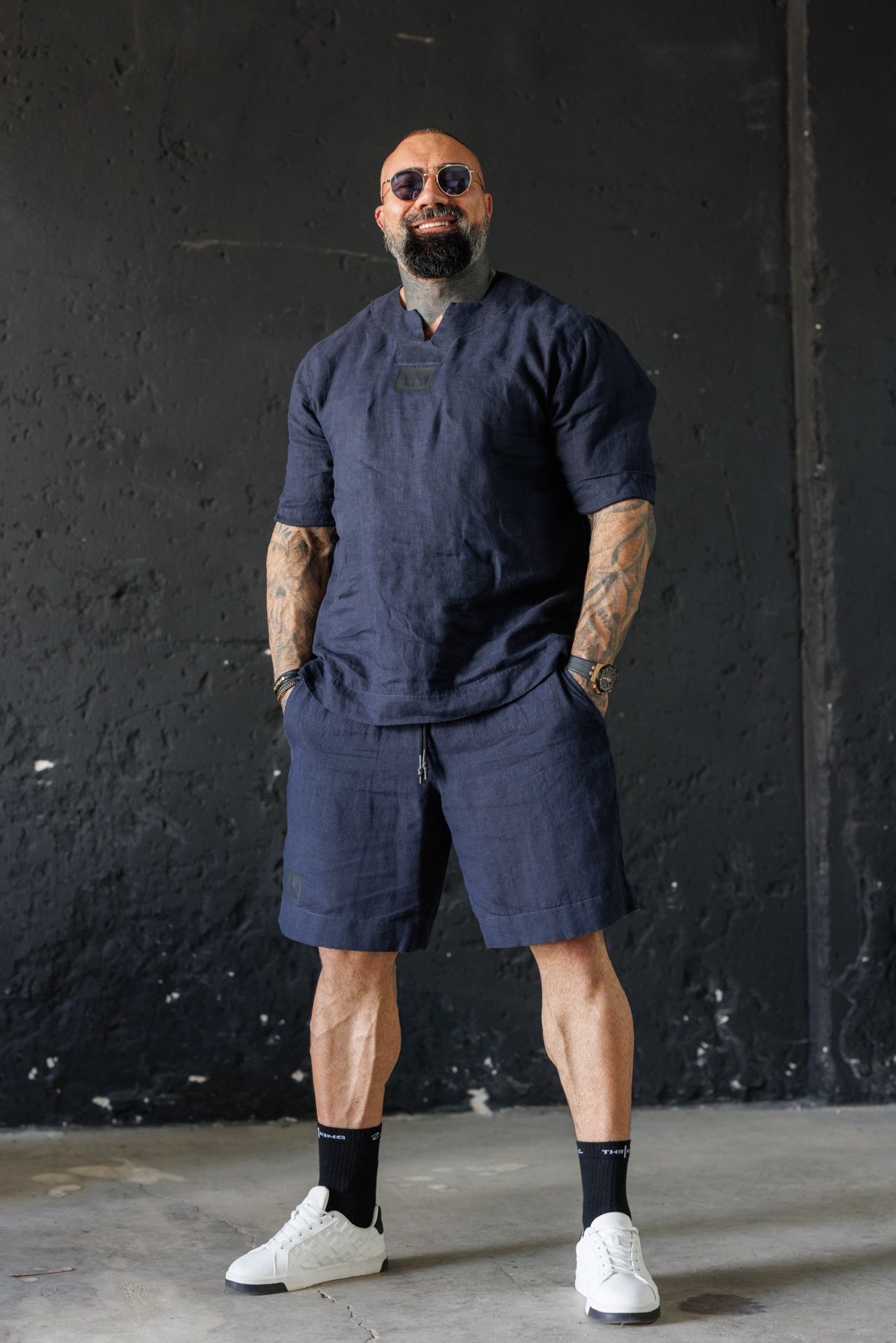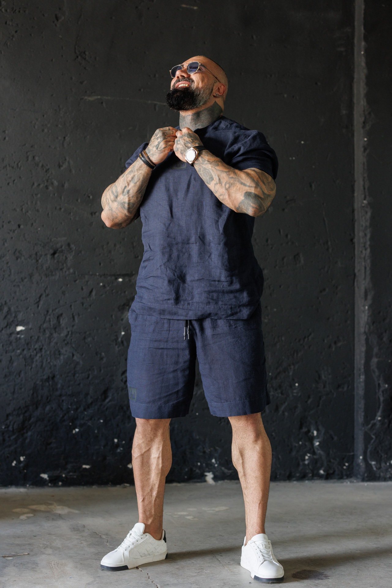Потопи се в летния комфорт с този елегантен мъжки комплект от лен в класически син цвят.