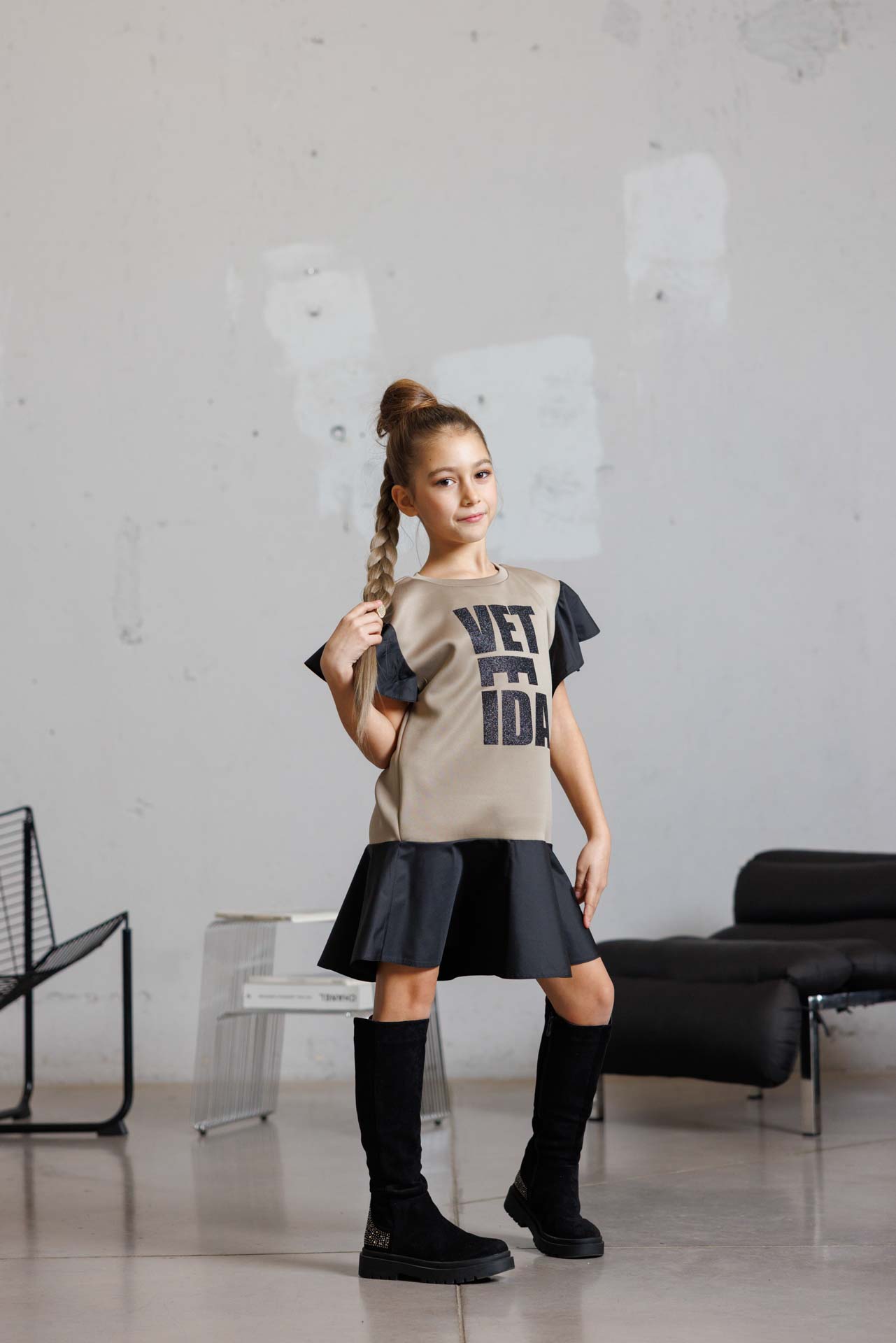Стилна детска рокля с модерен силует в бежов цвят-к022
