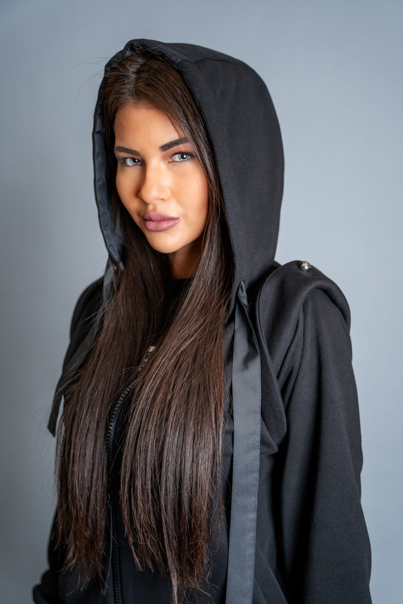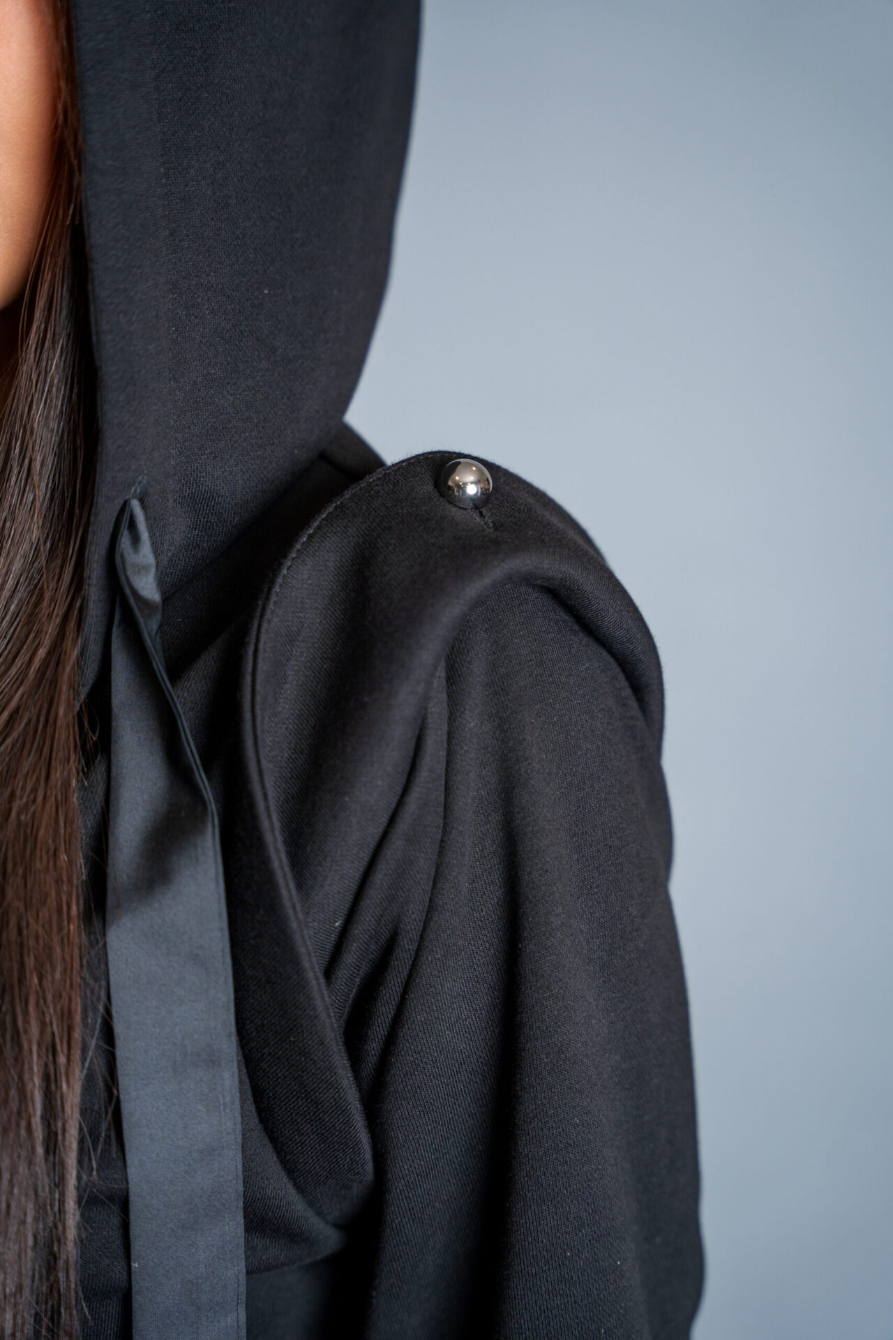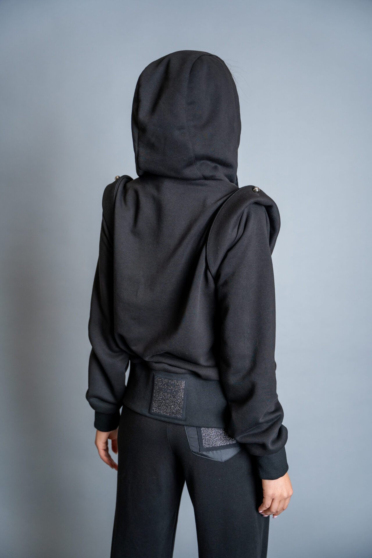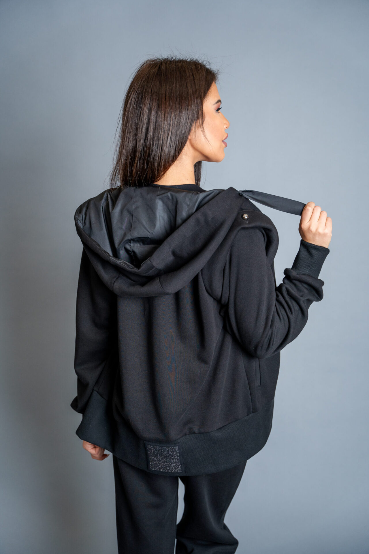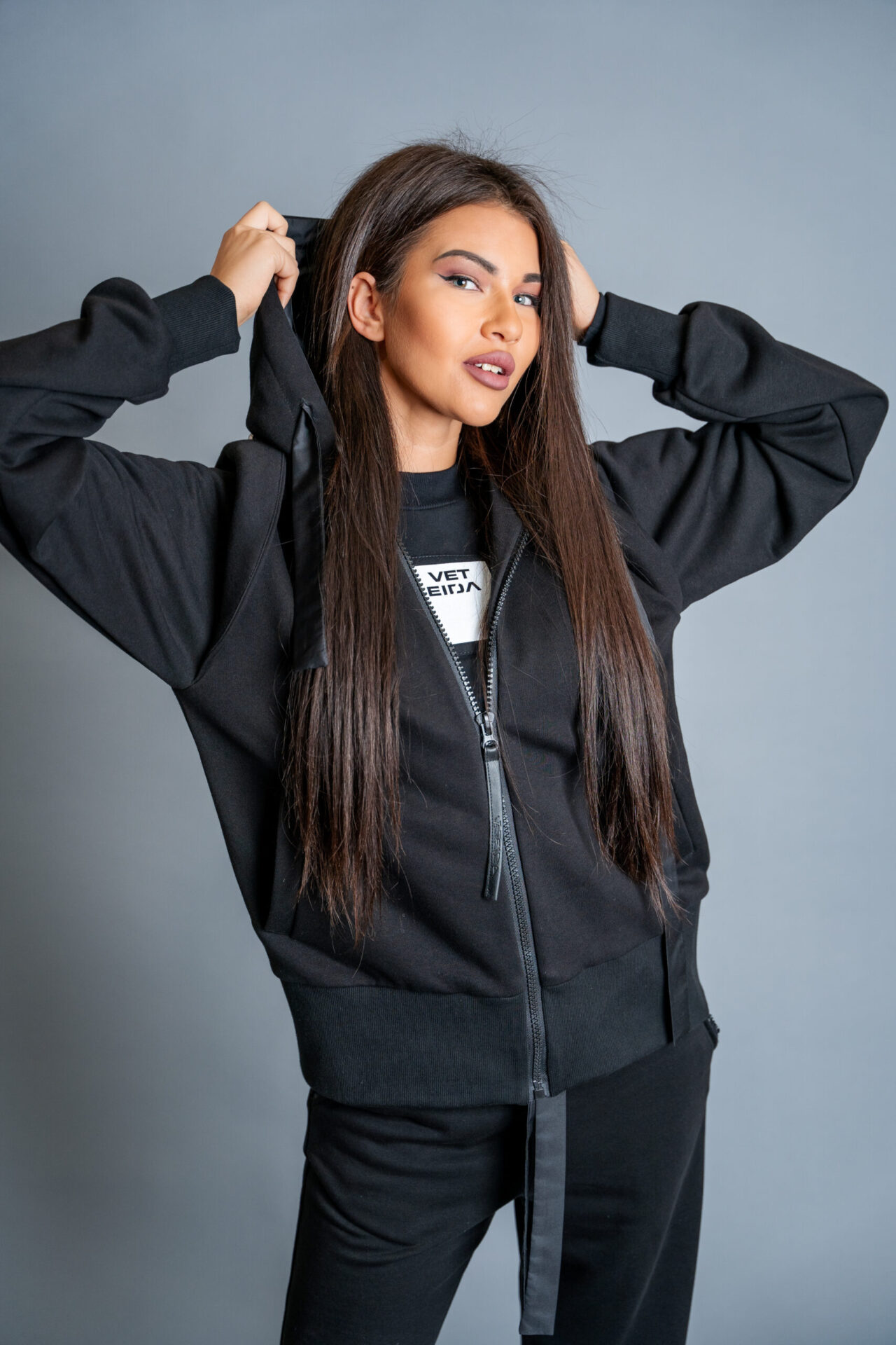 Горнището се отличава с фиксирана качулка с шнур, авторски бранд-Veteida.